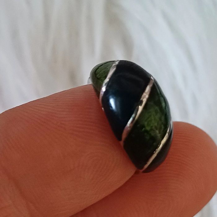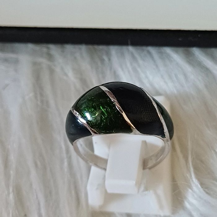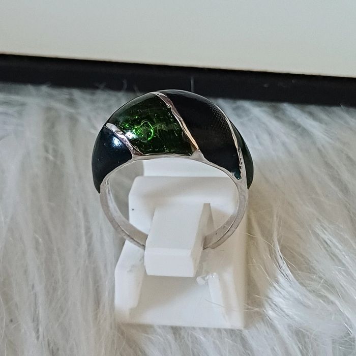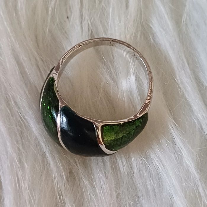 Bague en métal argenté et vert émaillé - photo numéro 1