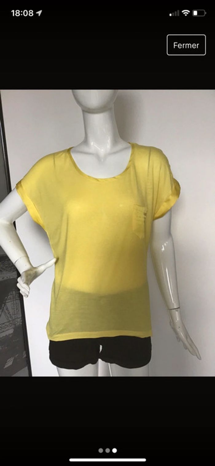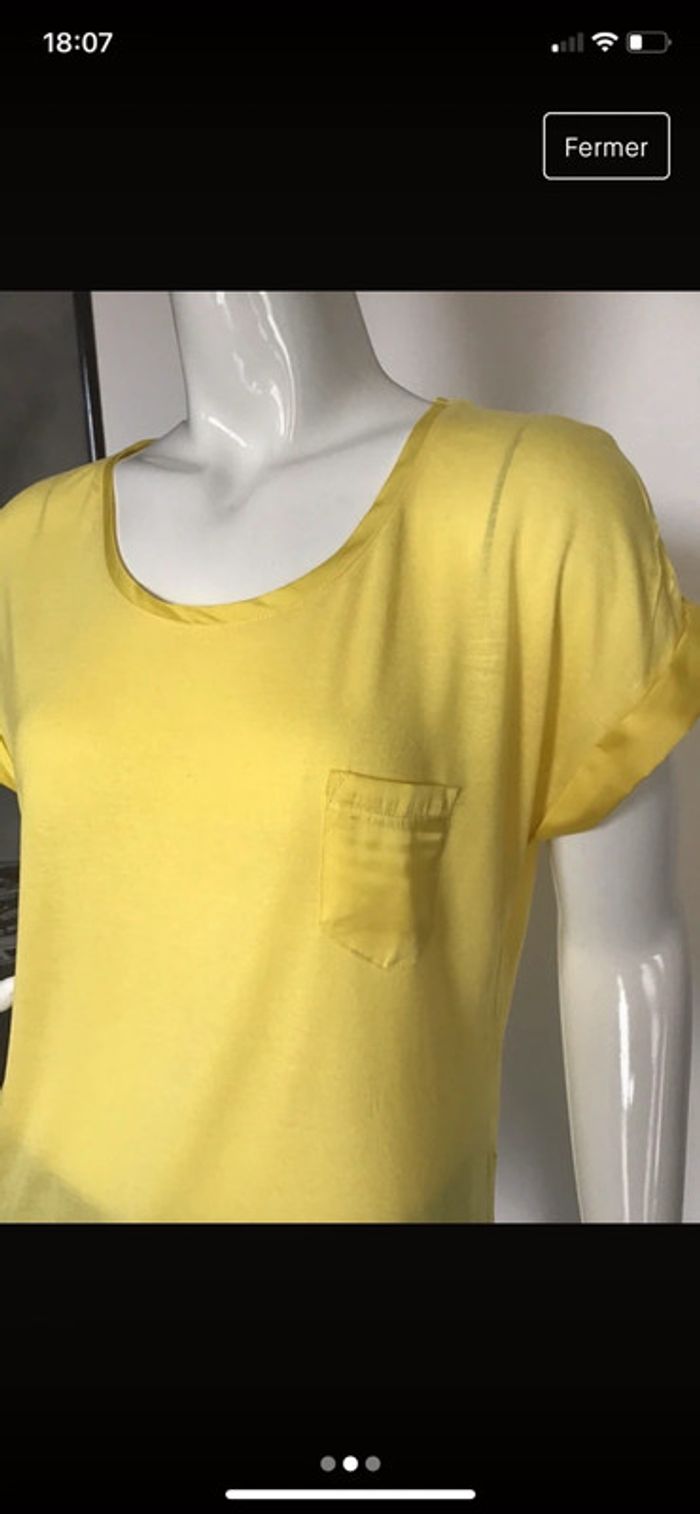 Teeshirt loose jaune Encolure et bord des manches en matière satinée Viscose et polyester #teeshirt #femme #loose #jaune #bimatière #hetm #tendance #commeneuf #chantalmatejahauts36 #chantalmatejachame #chantalmateja2023