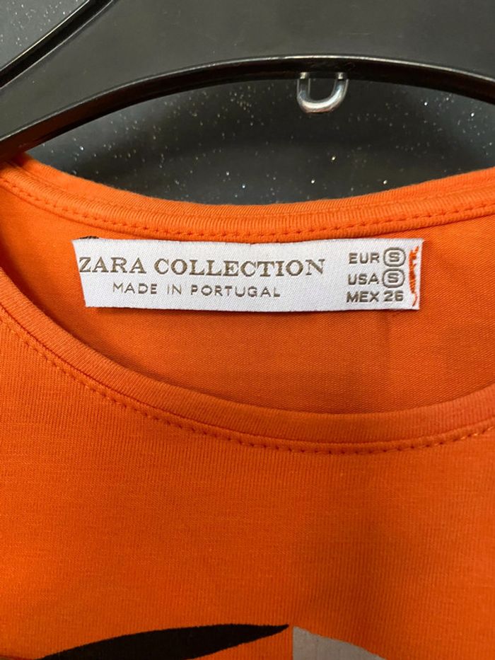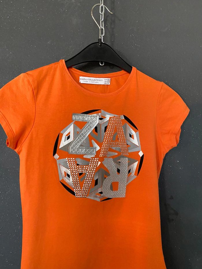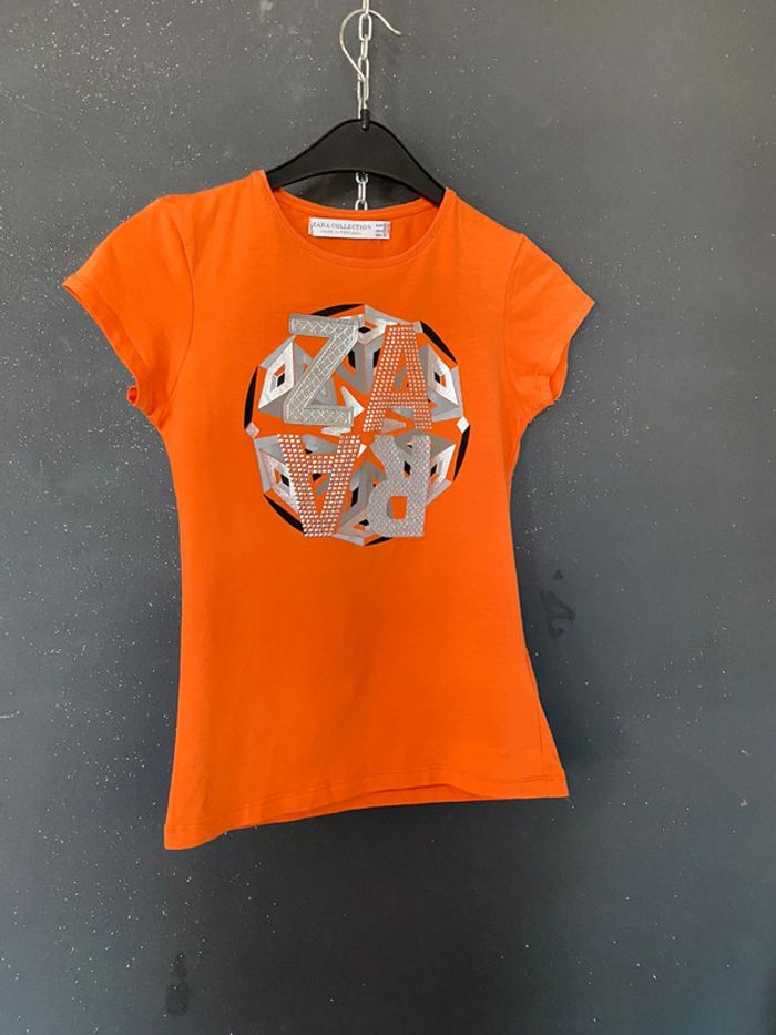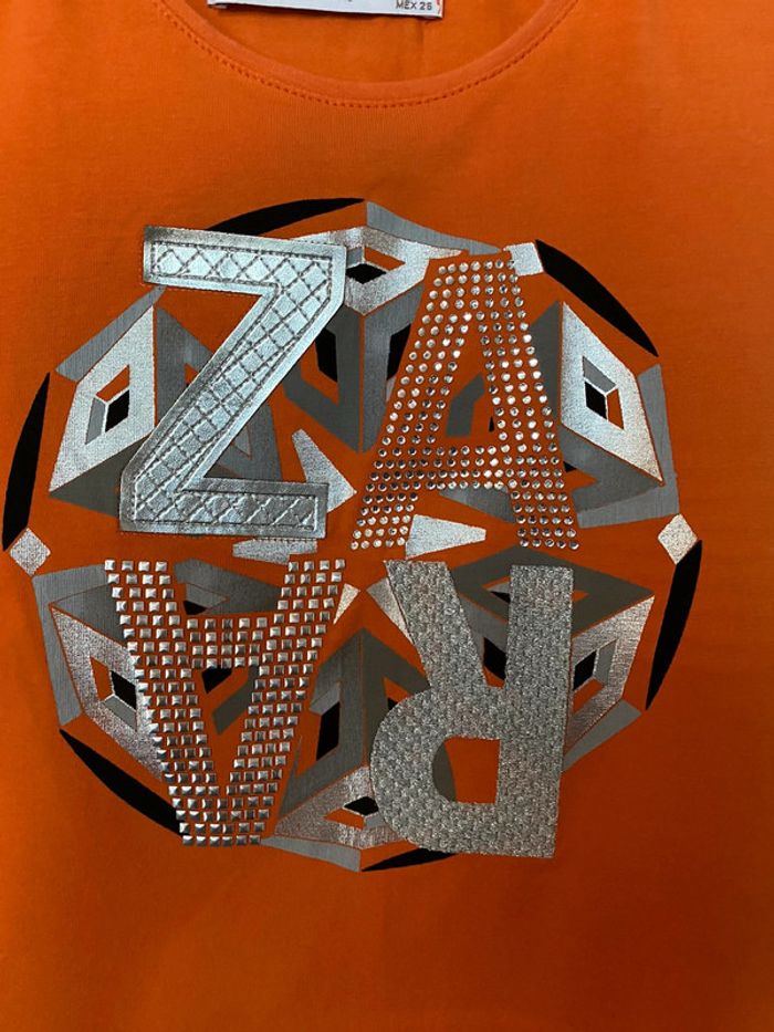 Teeshirt orange avec motifs collés strass ruban pailleté etc Près du corps taille s qui pourrait éventuellement convenir à xs Une maille de rattrapée dans le bas voir derrière photo Epaules 31,5 95% coton et 5 % d’élasthane #teeshirt #femme #fille #zara #orange #motifs #strass #chantalmatejahauts36 #chantalmatejamalo #chantalmateja2023