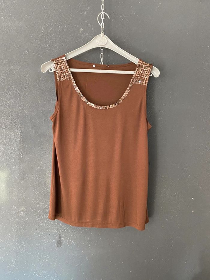 Top débardeur à pampilles aux épaules Marron chocolat 100% viscose Taille 4 longueur 65 cms et 49,5 sous les aisselles #top #débardeur #marron #pampilles #taille4 #chantalmatejahauts42 #chantalmatejachame #chantalmateja2023