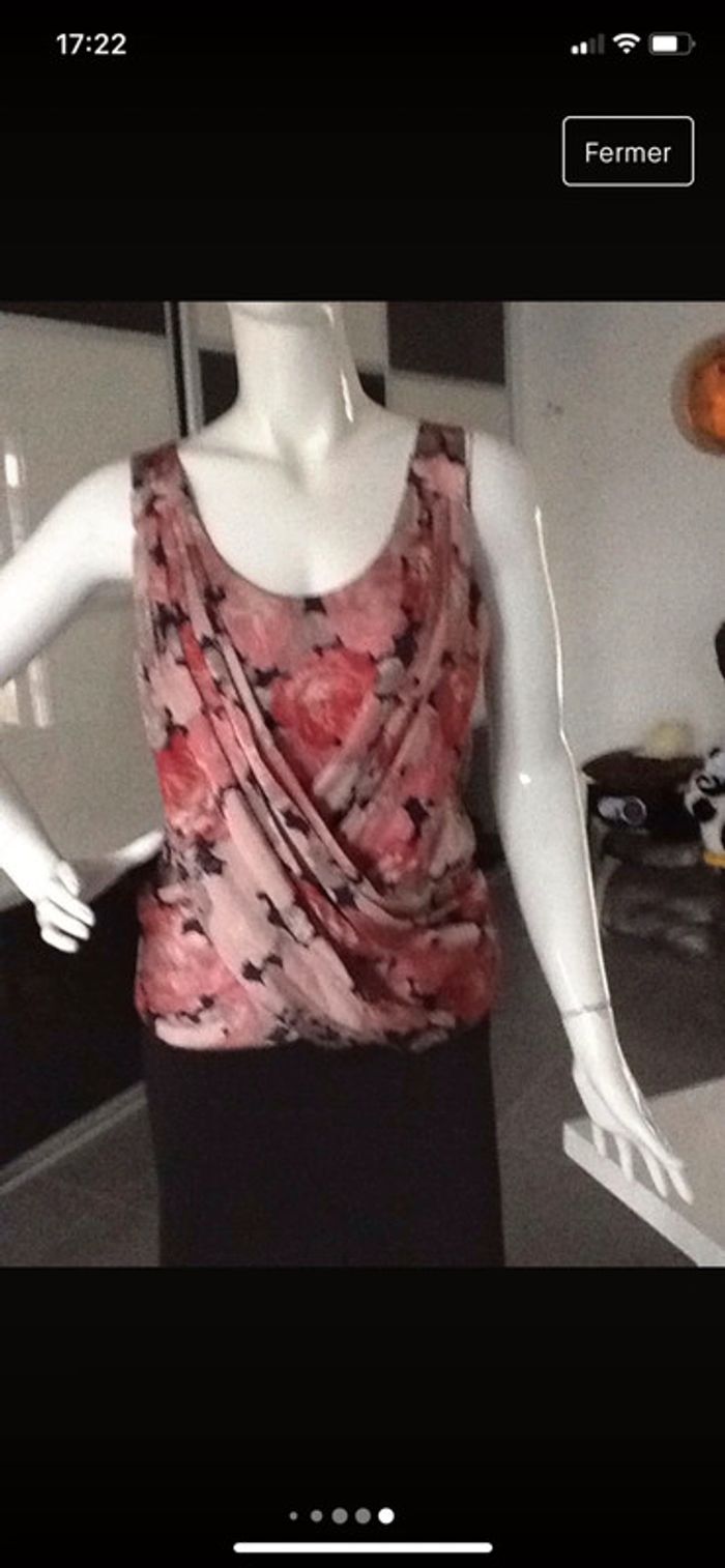 Top haut blouse chemisier très original avec ses deux bandes de tissu sur le devant Coloris corail rose noir Polyester #top #haut #blouse #chemisier #vintage #chic #tenuedefête #corail #rose #noir #polyester #athypique #chantalmatejahauts36 #chantalmatejatenuedefete #chantalmatejachame #chantalmateja2022