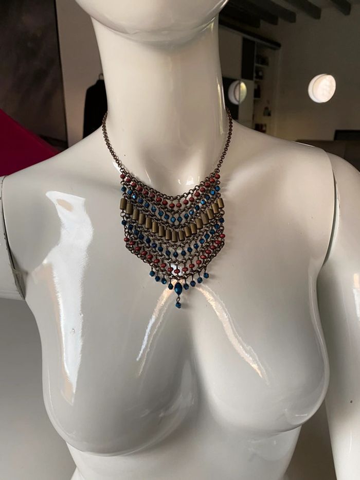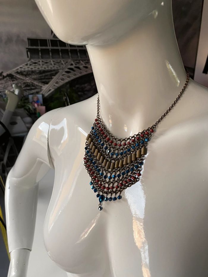 Collier fantaisie composé de chaînettes vieil or et de perles bleu et bordeaux #collier #fantaisie #chainettes #vielor #perles #bleu #bordeaux #chantalmatejabijoux #chantalmatejamalo #chantalmateja2022
