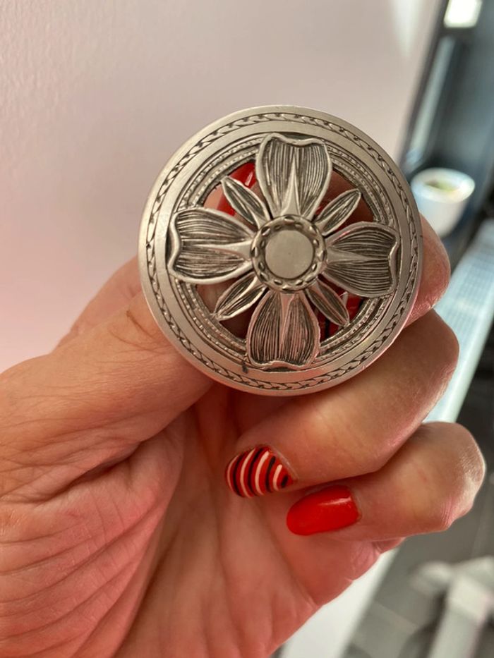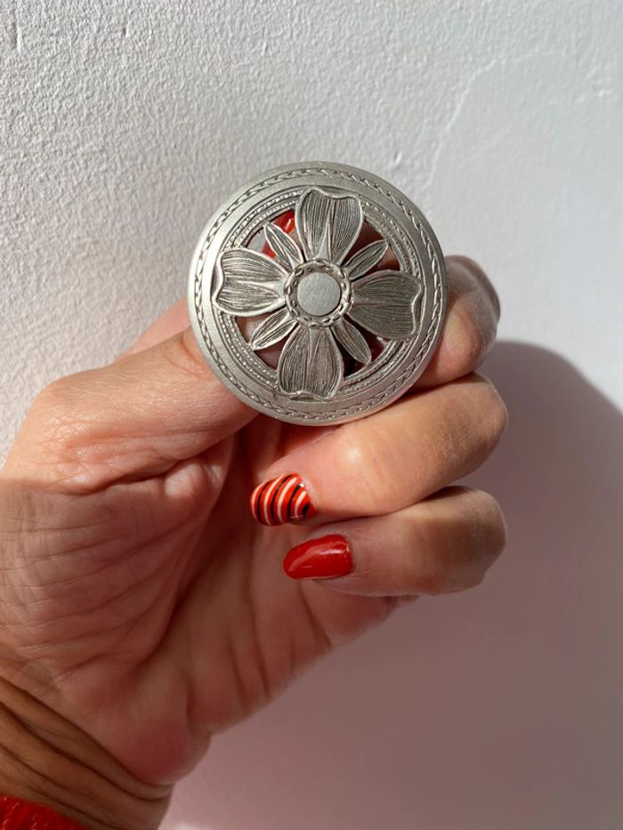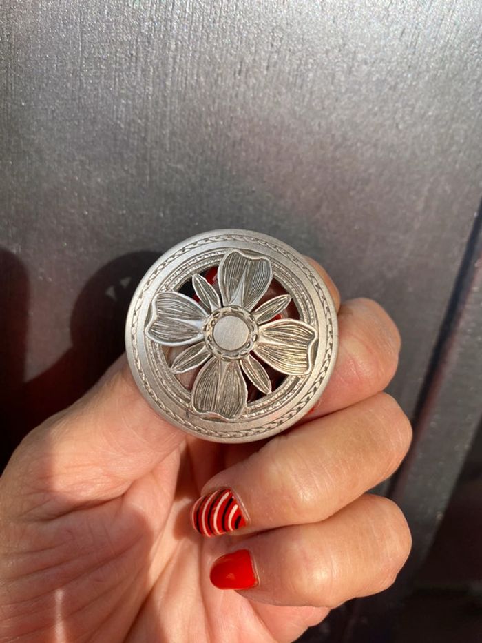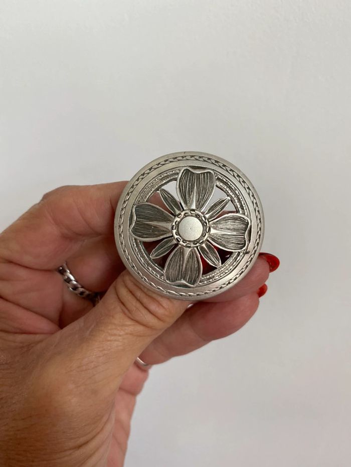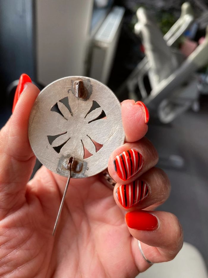 Broche ronde de 4,4 cms de diamètre A été probablement ressoudée ou soudée mais ce n’est pas discret cependant c’est dessous Bijou de famille des années 50 en metal serait de l’étain ou de l’argent mais pas de poinçon Poids 16 grammes #broche #vintage #50s #argent #etain #chantalmatejabijoux #chantalmateja2022 #chantalmatejachame
