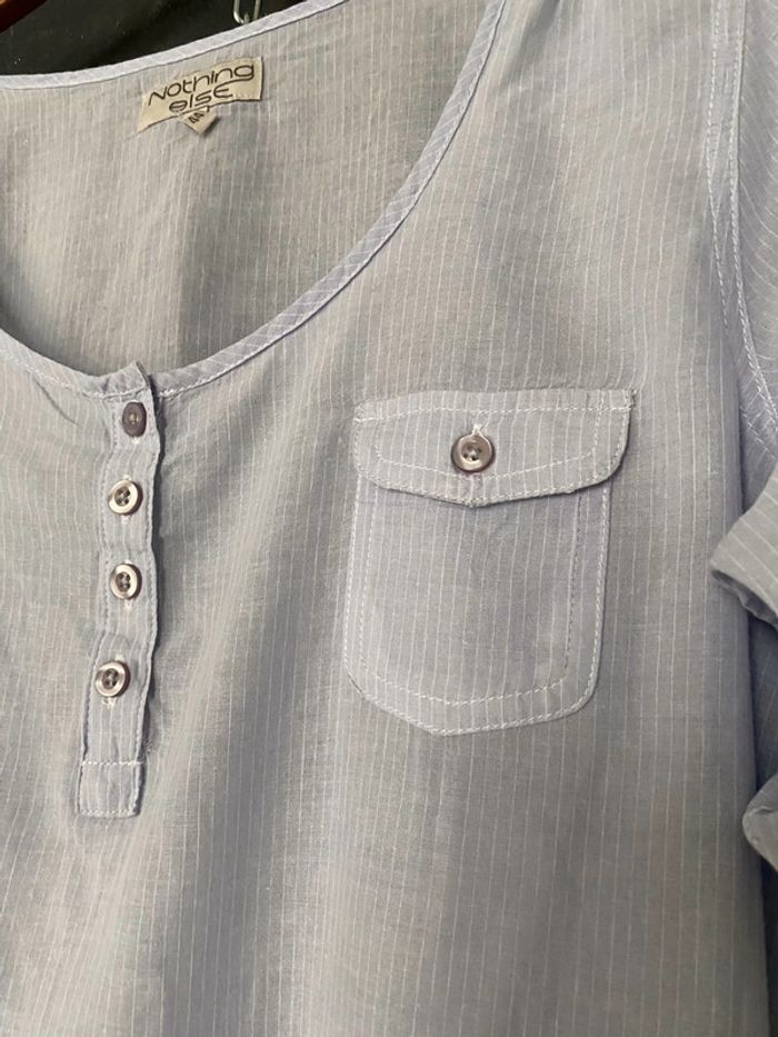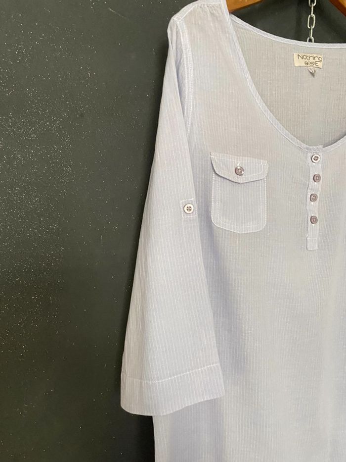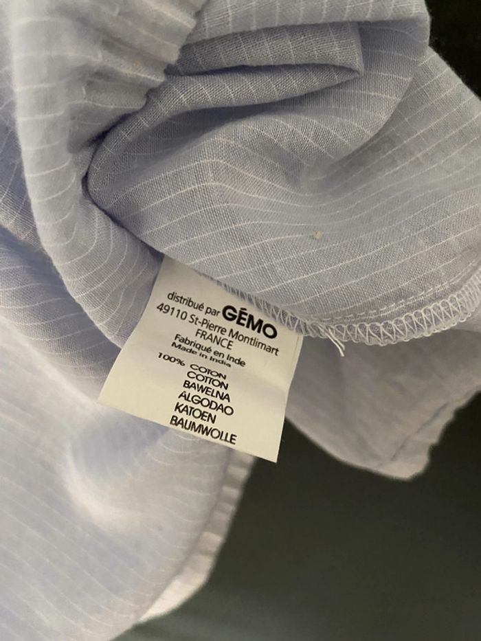 Blouse tunique bleu violine rayé blanc 100# coton Manches trois quart pouvant être retroussées Taille ancienne 44 mais semble convenir àun 42 ou grand 40 Mensurations - épaules de couture à couture 42 cms Sous les aisselles 56 cms Hauteur env 70 cms en partant du milieu d’épaule Fabrication en Inde distribué par gemo Galon dans le bas qui ne resserre pas et petits noeuds cousus Merci de vérifier les mensurations afin d’éviter toute déception #chantalmateja2022 #blouse #tunique #gemo #vintage #nothingelse #bleuvioline #leger #été #printemps #tailleunique #chantalmatejahauts40 #chantalmatejahauts42 #chantalmatejachame