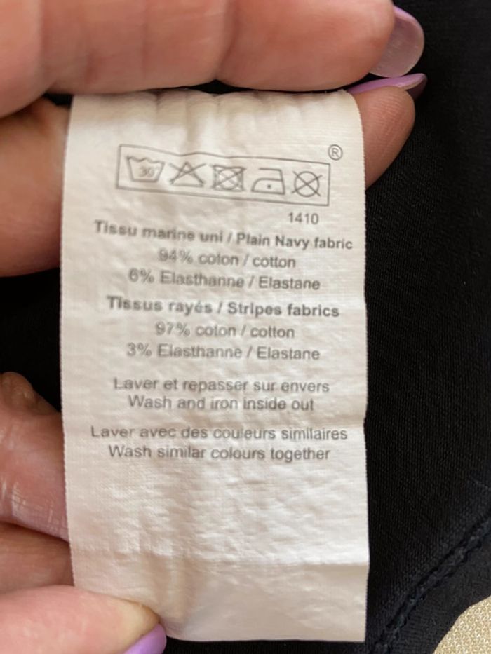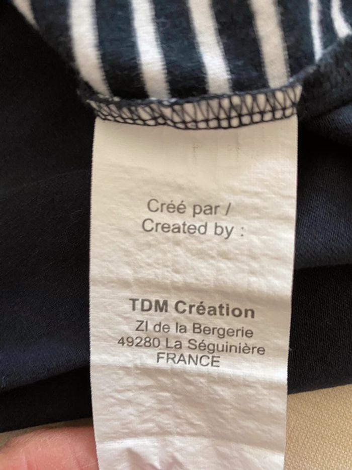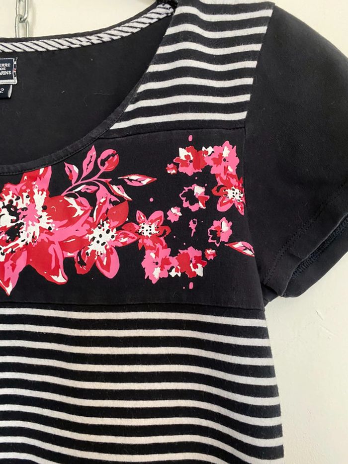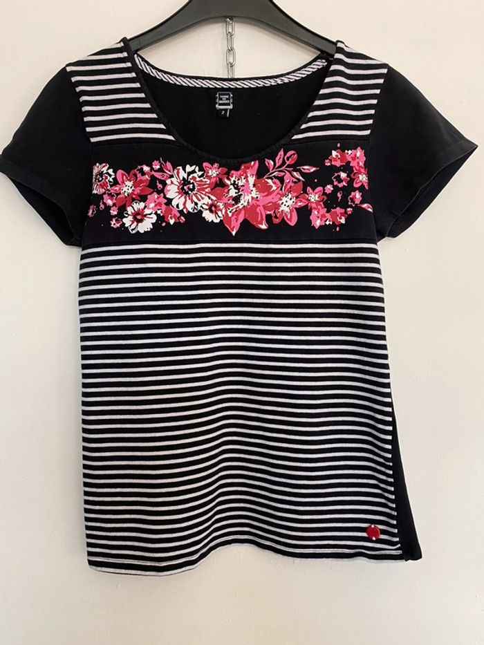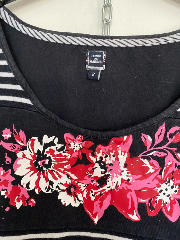 teeshirt rayé marine et blanc taille 2 une bande à motif floral à mettre en teeshirt ou haut de pyjama article porté mais ni accroc ni tache #chantalmateja2022 #teeshirtfemme #terredemarins #marineetblanc #chantalmatejahauts38 #chantalmatejapyjamas #chantalmatejachame