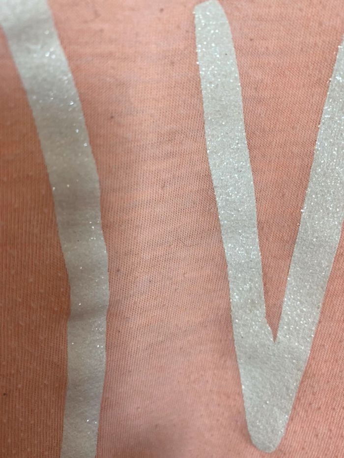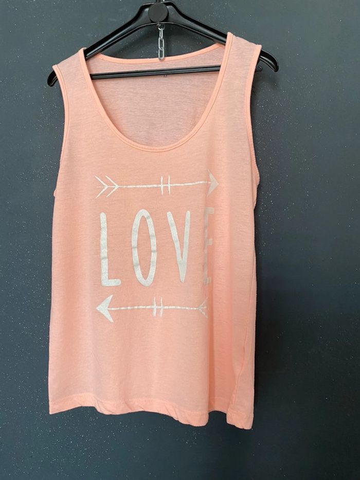 haut de pyjama type marcel inscription Love blanc pailleté coloris saumon taille M 33% coton le reste polyester qq bouloches mais pas de accroc ni de taches #top #marcel #hautdepyjama #saumon #paillettes #bronzini #chantalmateja2022 #chantalmatejapyjamas