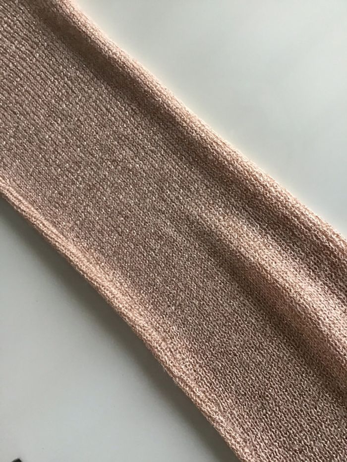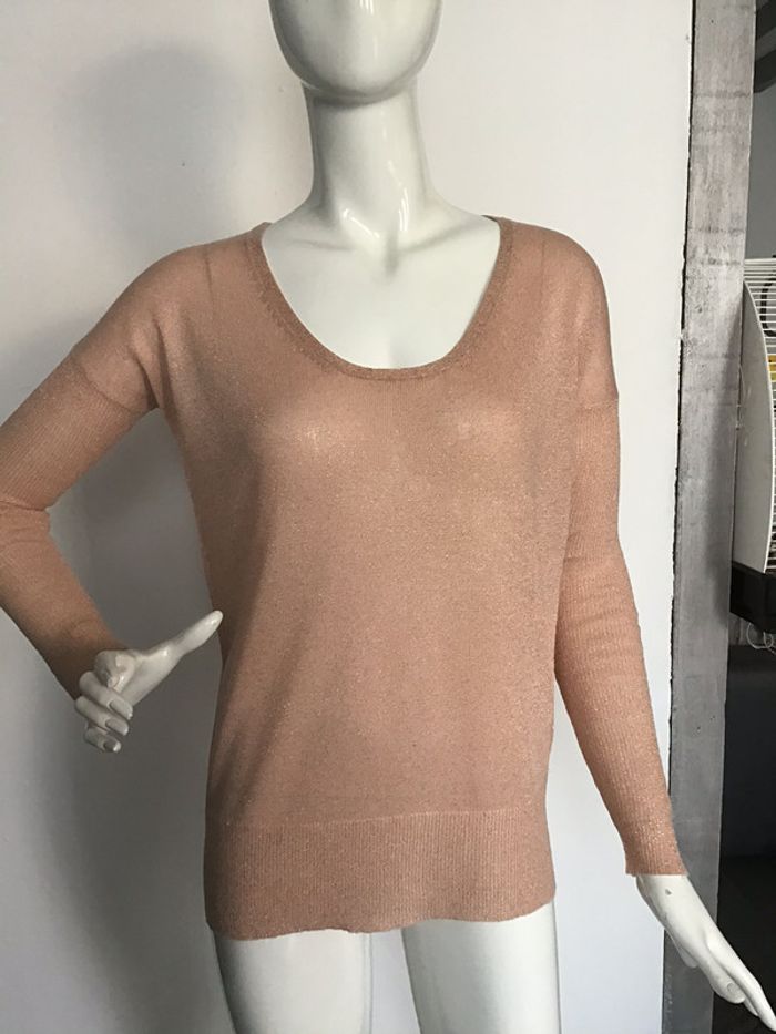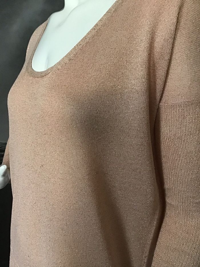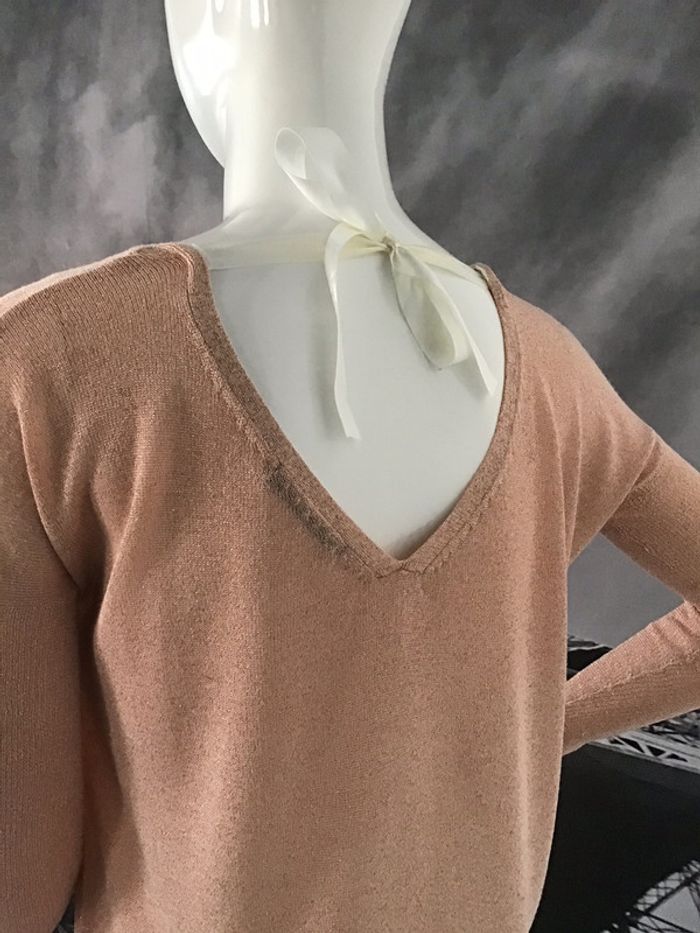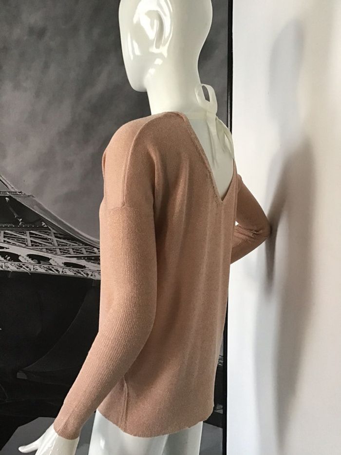 pull fin avec ouverture en V derrière couleur nude avec des paillettes cuivrées forme loose pourrait convenir à différentes tailles des mensurations peuvent vous être fournies #chantalmateja2021 #pullfemme #pullfin #loose #paillettes #nude #décolleté #decolletedos #chantalmatejapullsfemme