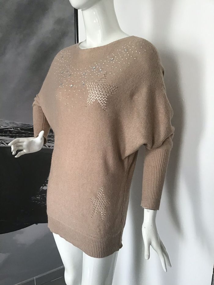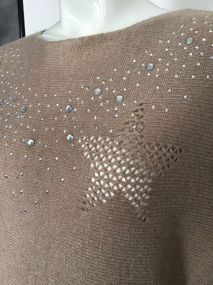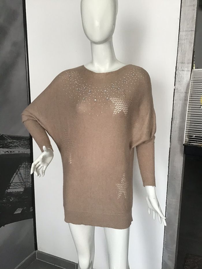 pull long avec des motifs en maille ajourée devant et des strass manches chauve-souris longs poignets en côte Article très ancien a été porté à quelques bouloches mais ni troué ni mailles sautées raison pour laquelle je et bon état taille S/M peut convenir à un 36 comme sur le mannequin ou à un 38 loose jusque sous les aisselles peut être porté avec une ceinture longueur 73,5 en partant de la base du cou #chantalmateja2021 #pull #loose #chauvesouris #s #m #vintage #strass #mailleajourée #athypique #chantalmatejapullsfemme