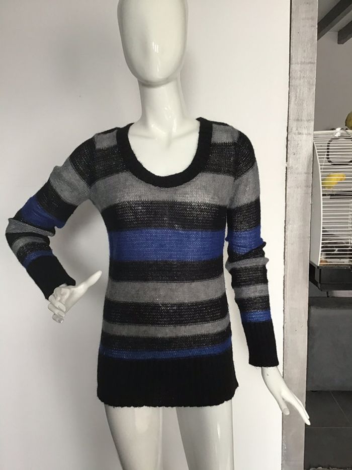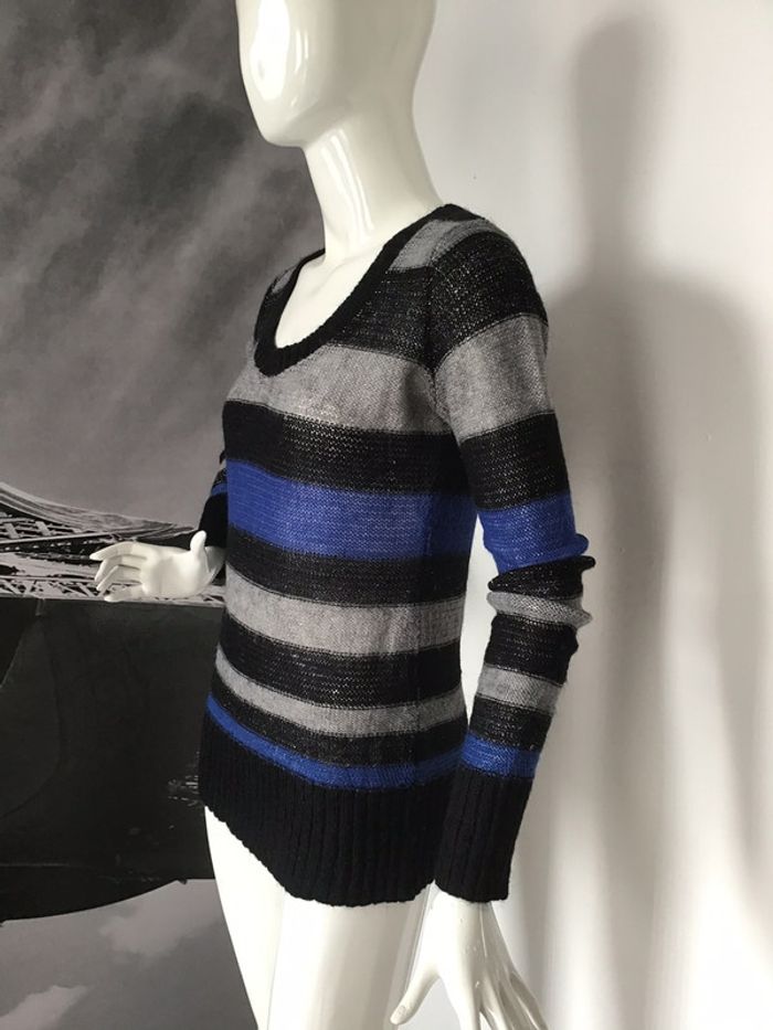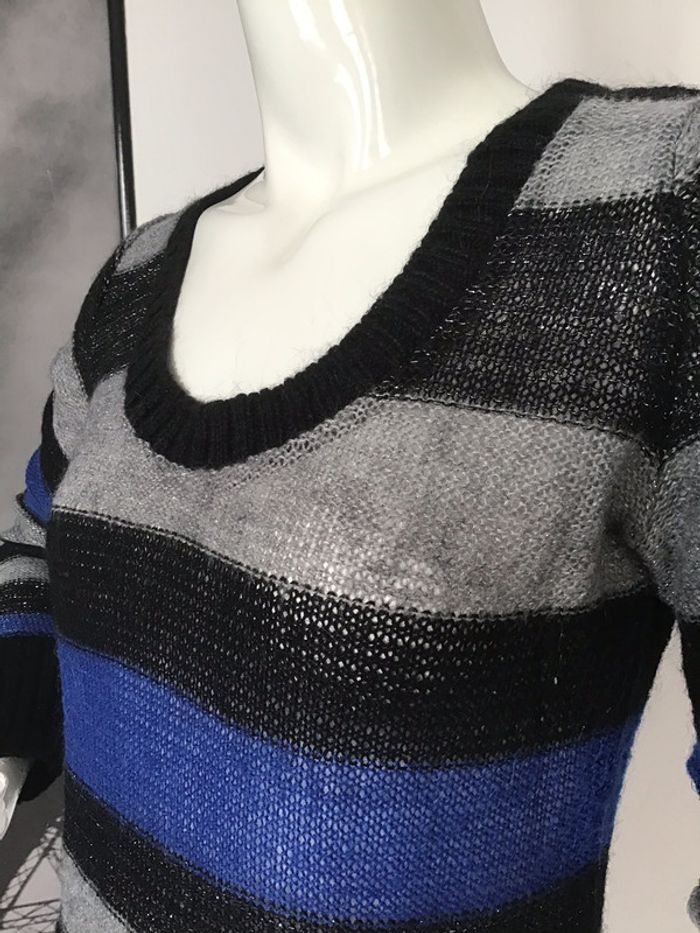 pull fin noir, gris et bleu dur avec des fils argentés qui ne se voient pas très bien sûr les photos plus d etiquette mais contient de la laine plus de l acrylique article ancien porté mais ni troué ni taché 36 pouvant être porté également par un 38 car extensible #chantalmateja2021 #pullfin #pullfemme #leger #vintage #chantalmatejapullsfemme