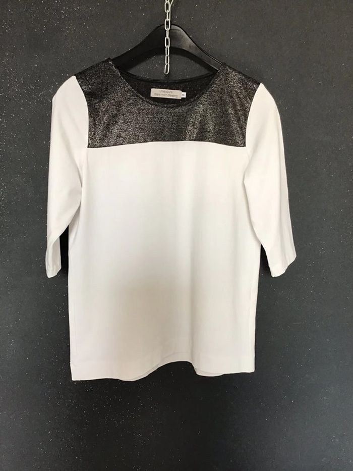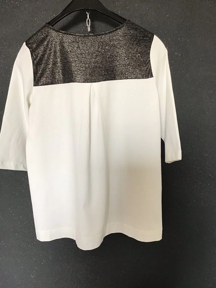 haut avec plastron noir pailleté manches mi longues petit pli creux dans le dos 96% coton et 4% elasthane taille 0 correspond a 36 cependant peux convenir à un 38 #chantalmateja2021 #blouse #top #maillot #teeshirt #haut #chantalmatejahauts38 #chantalmatejahauts40 #chantalmatejaval