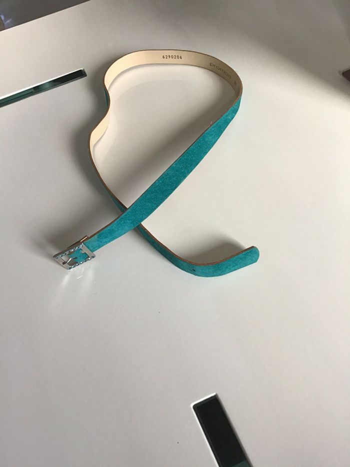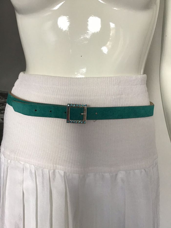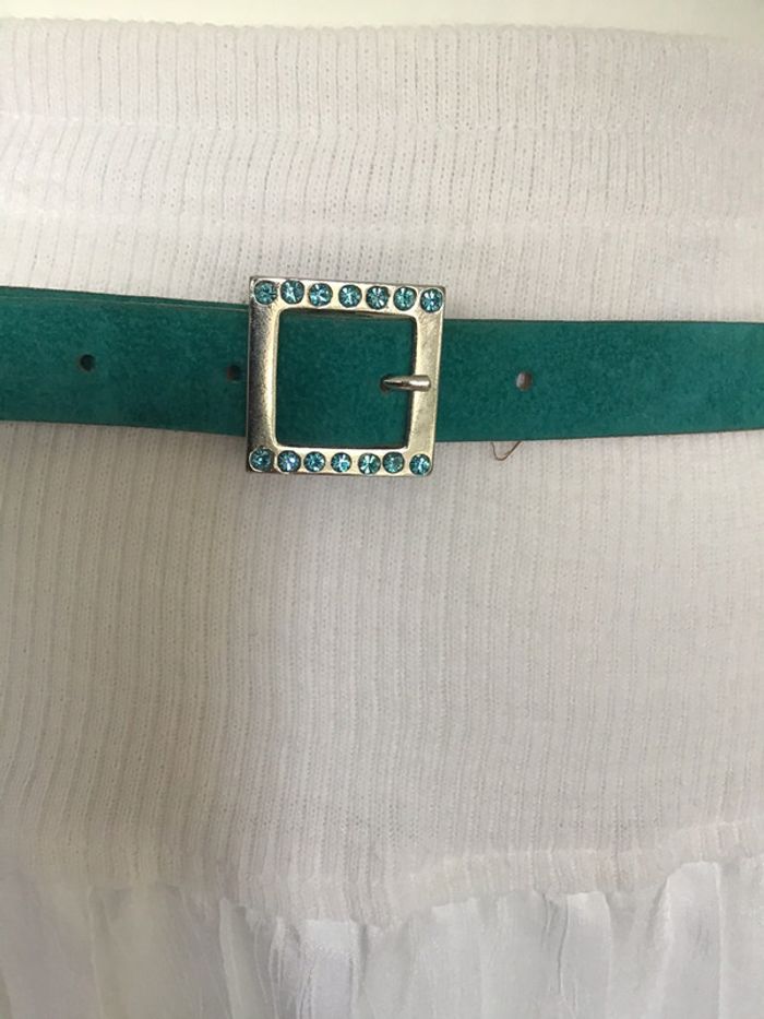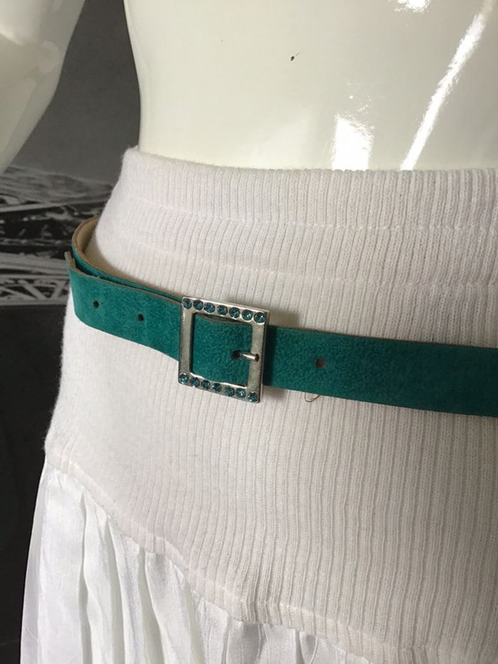 ceinture bleu canard .. vert avec des strass turquoise sur la boucle article vintage en tbe car peu porté en synthétique effet nubuk fabrication en Belgique numéro 6290206 taille 80 origine promod #chantalmateja2021 #ceinturefemme #taille80 #nubuk #bleucanard #turquoise #tbe #vintage #chantalmatejaceintures #chantalmatejamalo