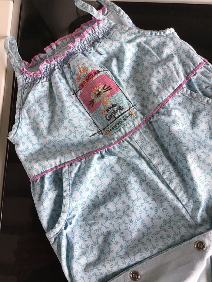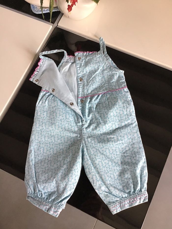 salopette à bretelles pressions à l entrejambe et dans le dos smocks devant avec petit motif doublée matière coton #chantalmateja2020 #salopettefille #salopette #vintage #lacompagniedespetits #chantalmatejatroismois