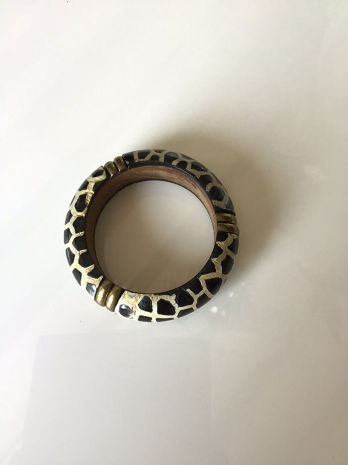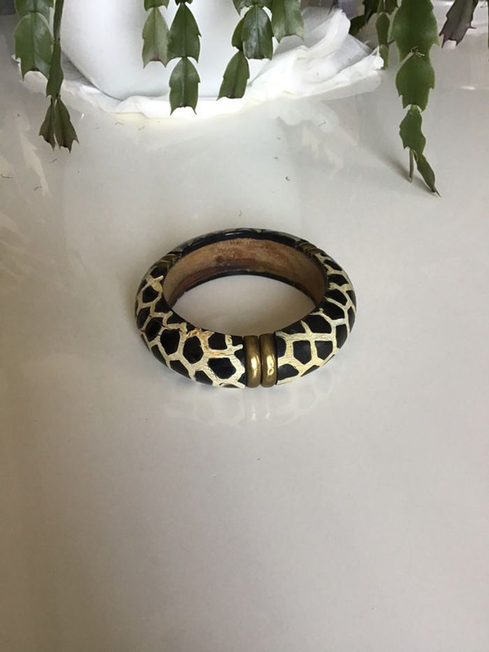 bracelet de 9 cms de diamètre dont 6,5 pour passer la main motifs noirs beige et doré légèrement craquelé à un endroit vu son âge mais c est un article vintage et visible sur les photos largeur du bracelet env 2 cms #bracelet #braceletvintage #bois #résine #noir #doré #chantalmateja2020 #chantalmatejabijoux #chantalmatejamalo