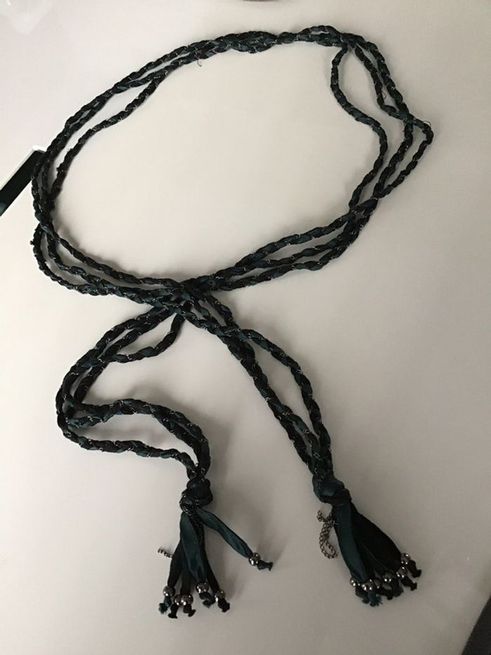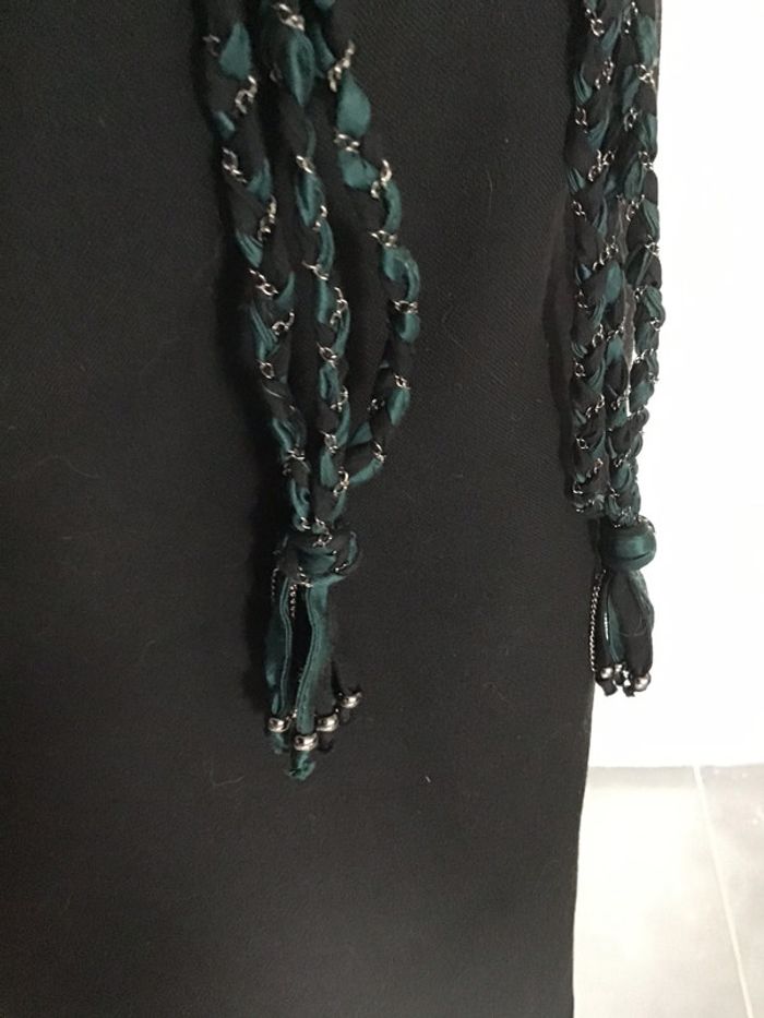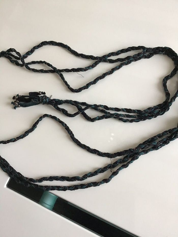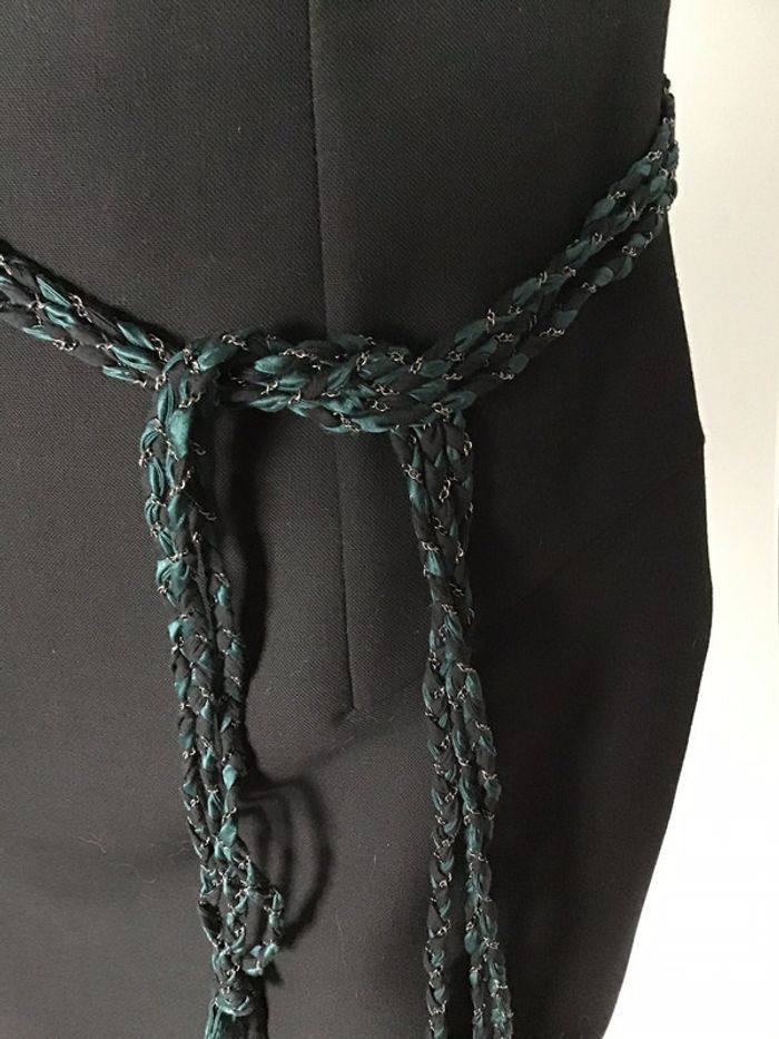 ceinture composée de trois tresses faites de ruban galon noir et vert pub + une fine chaînette couleur argenté extrémités nouées longueur env 129 #ceinturevinge #ceinturetressée #vintage #noir #vert #argenté #chantalmatejaceintures #chantalmateja2020 #chantalmatejachame