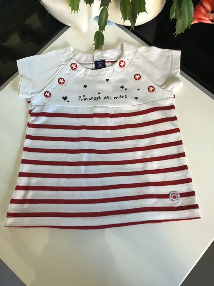 tee shirt blanc rayé rouge petits boutons décoratifs sur les côtés 9 mois #teeshirt #teeshirtfille #terredemarin #chantalmatejaneufmois #chantalmatejavic #chantalmateja2020