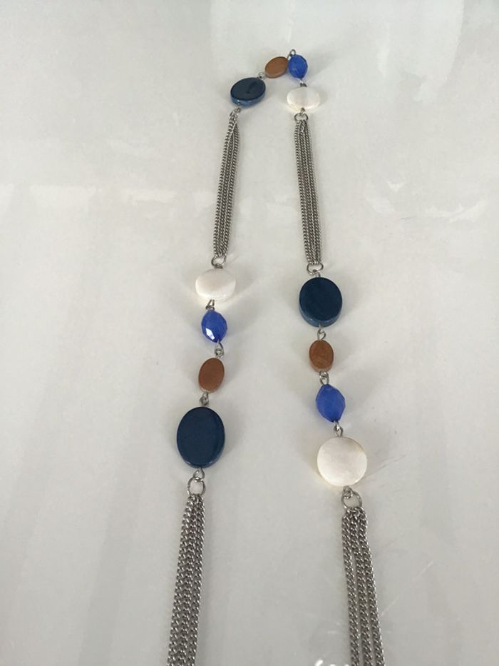 collier sautoir de 51 cms à plat couleur marine irrise bleu dur ivoire marron glacé sur chaînettes couleur argent #colliervintage #sautoir #bleu #argenté #ivoire #marron #chantalmatejabijoux #chantalmateja2020 #chantalmatejamalo