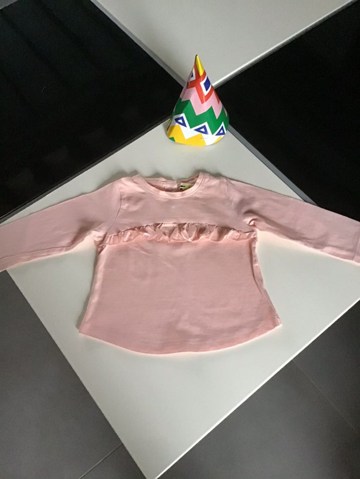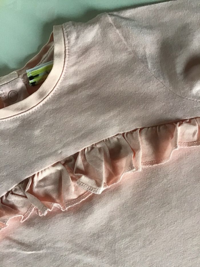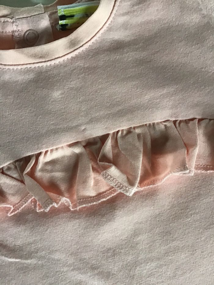 tee shirt rose avec des paillettes dans le petit volant coton et polyester mais plus d étiquette 9 mois 71 cms #teeshirtfille #teeshirtfille9mois #tapealoeil #rose #paillettes #chantalmatejaneufmois #chantalmatejavic #chantalmateja2020
