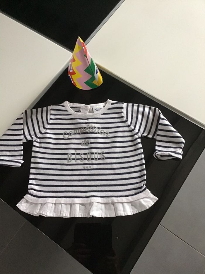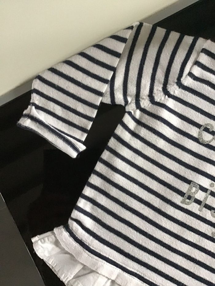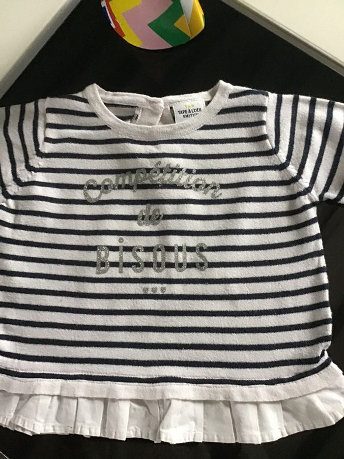 tunique rayée avec petit volant dans le bas inscription competition de bisous en paillettes argent 9 mois 71 cms #tunique #tunique9mois #blouse9mois #rayée #marineetblanc #tapealoeil #chantalmatejaneufmois #chantalmatejavic #chantalmateja2020