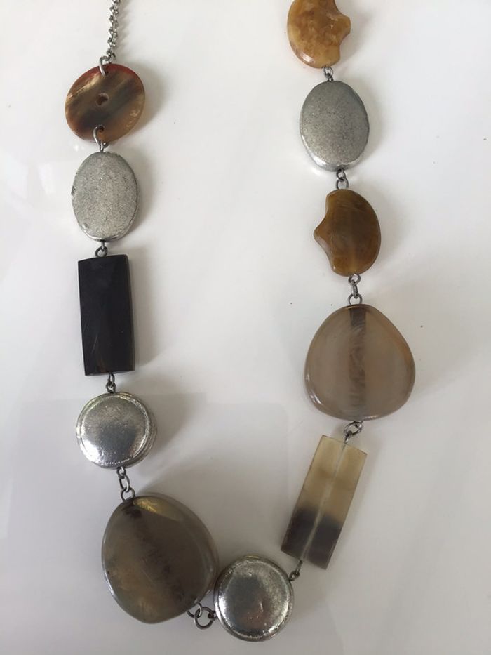 collier fantaisie aux couleurs dominantes marron et argenté article détenu depuis de nombreuses années les pièces métalliques sont légèrement martelées longueur totale 70 cms #collier #collierfantaisie #vintage #atypique #pvc #métal #pierre #chantalmatejabijoux #chantalmateja2020 #chantalmatejachame