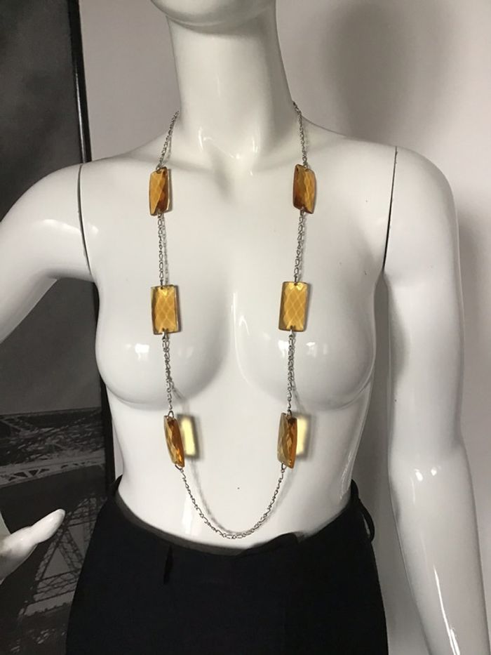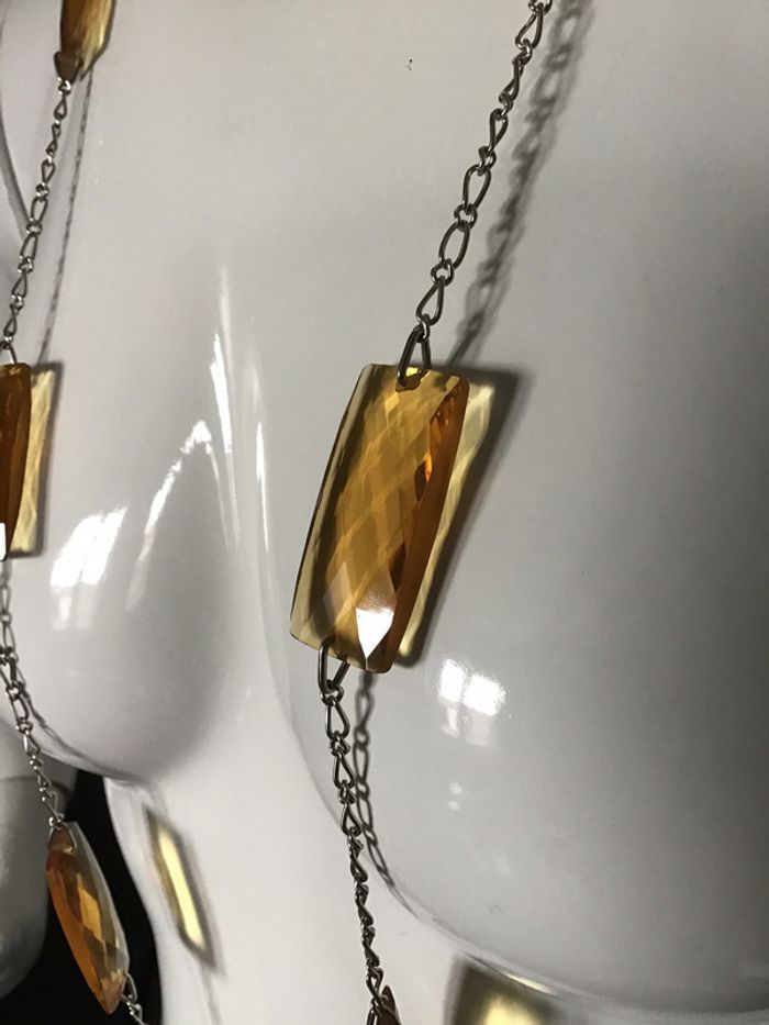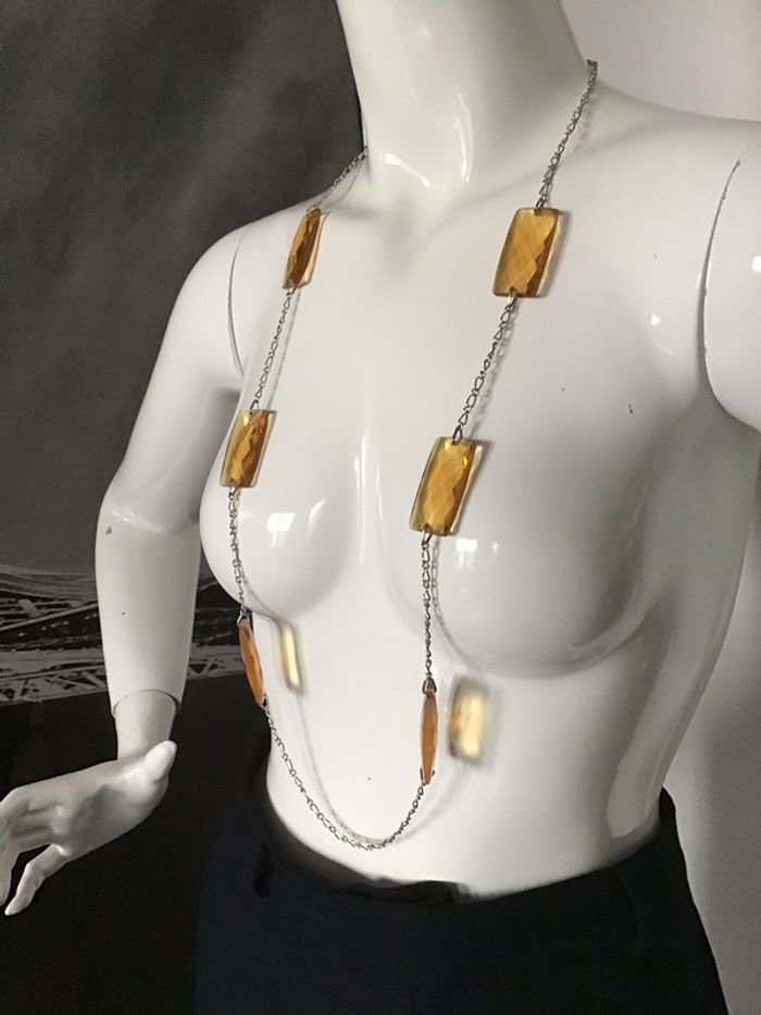 grand sautoir fantaisie vintage les rectangles cassables de couleur ambre sont fait d une matière que j ignore mais ce n est pas du verre longueur totale un mètre env #sautoir #vintage #ambre #chantalmatejabijoux #chantalmateja2020 #chantalmatejamalo
