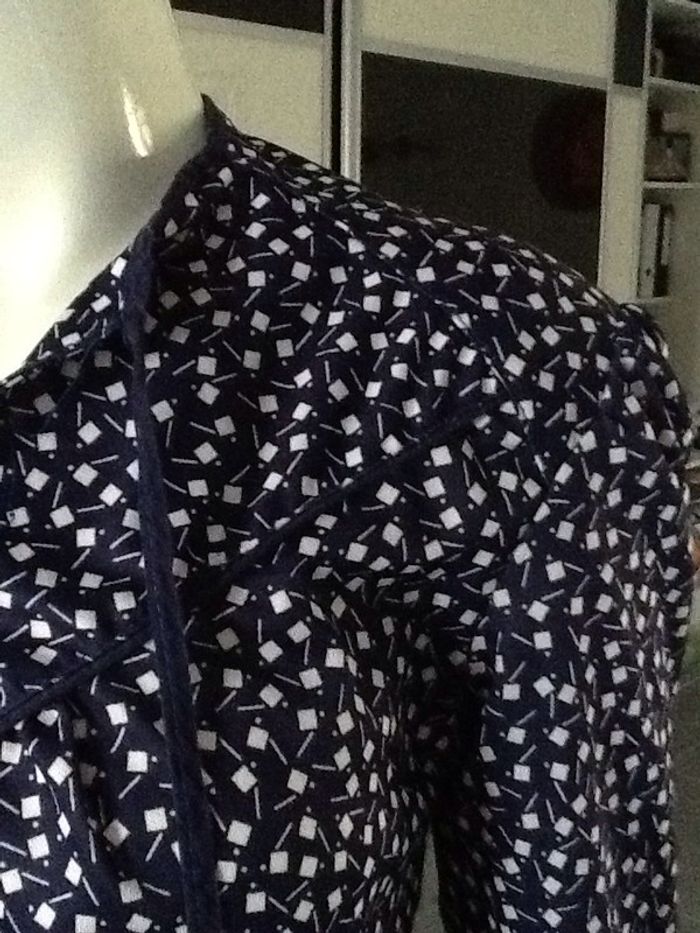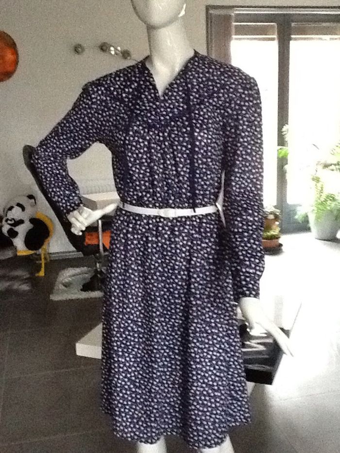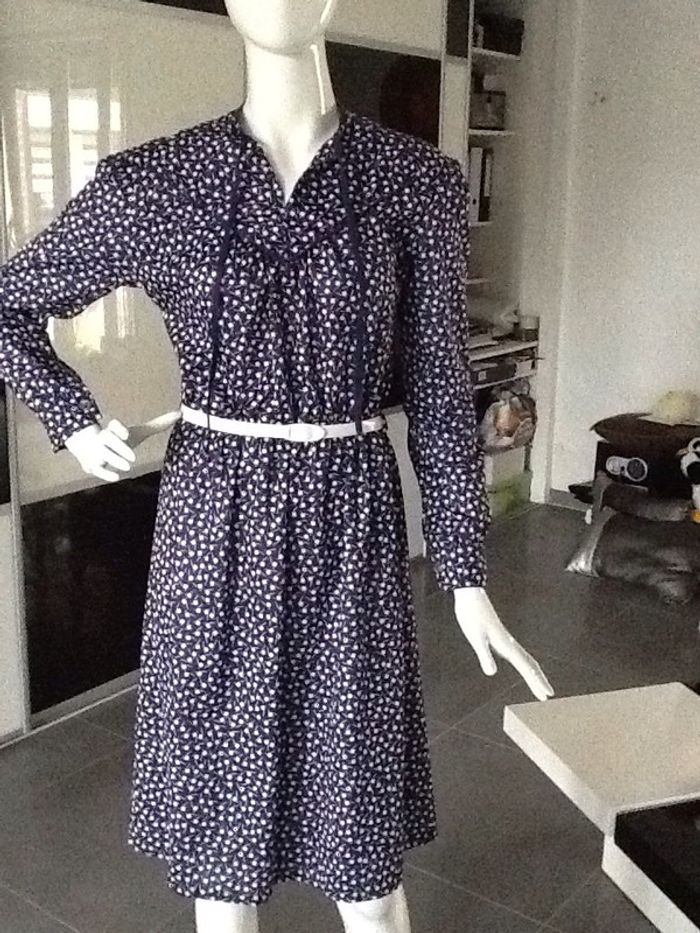 robe vintage marine a petits motifs vlancs manches longues avec bouto. au poignet petit col en V avec un cordon pouvant etre ferme matiere polyester melange fabrication en France🇫🇷 elastique a la taille #robevintage38 #robe38 #robemarineetblanc #chantalmatejarobes #chantalmatejachame #chantalmateja2019