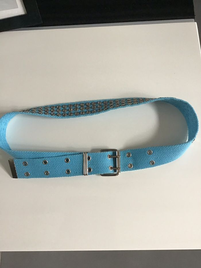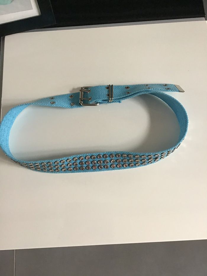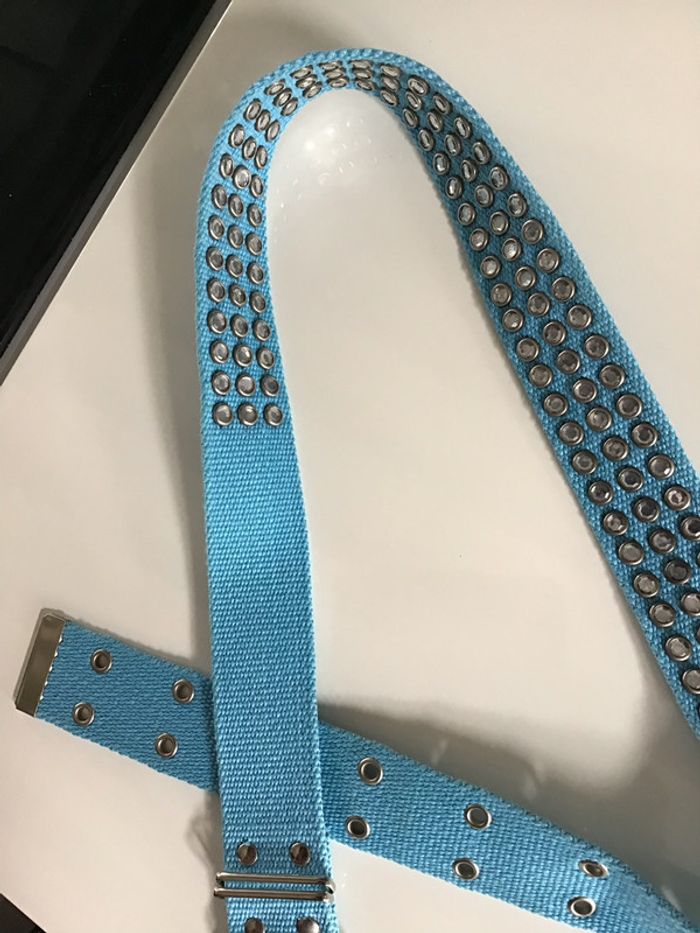 ceinture vintage bleu clair boucle à double fermeture par rivets série de rivet à strass fixés non collés largeur 3,7 cms longueur totale 1 m peut convenir à différents tours de taille compris entre 74 et 94 prévu davantage pour un tour de taille de 86 longueur de la boucle au 4ème trou qui est donc le central #ceinturevintage #toile #coton #bleu #rivet #strass #chantalmatejaceintures #chantalmateja2020