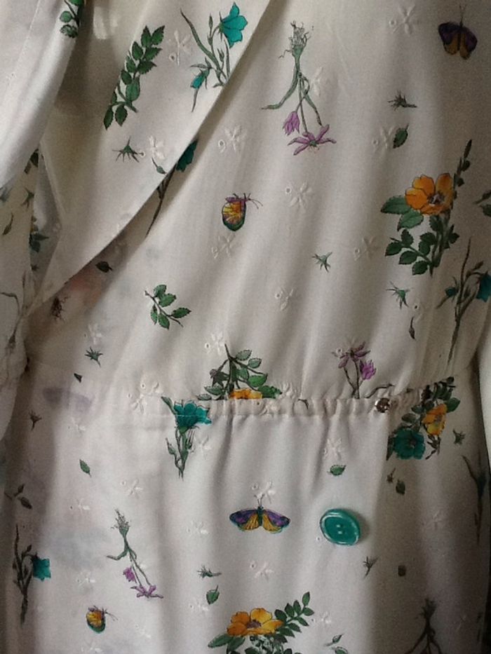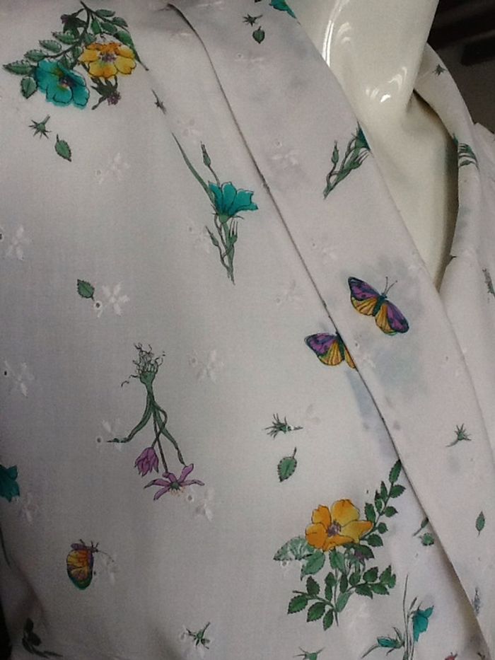 robe portefeuille vintage haut loose avec petites épaulettes aux épaules elastique peu serrant à la taille pour favoriser le loose maintien à la taille par deux pressions et boutons article fait par une couturière dans les années 80 tissu coton imprimé avec petites fleurs brodées ajourées partie du bas doublée largeur d'épaule de couture à couture 40 sous les aisselles 52 taille à plat 45 à porter de preference avec ceinture pour marquer davantage le loose de plus l élastique est volontairement peu serrant ceinture fournie à la demande (celle sur la photo) cependant peut être portée avec une ceinture large en tissu ou elastique longueur de la robe 108 en partant du milieu d'épaule 38/40 #robevintage #robefleurie #robe #portefeuille #robevintageportefeuille #vintage #80s #robevintagechic #loose #blousant #chantalmatejarobes38 #chantalmatejarobes40 #chantalmateja2019