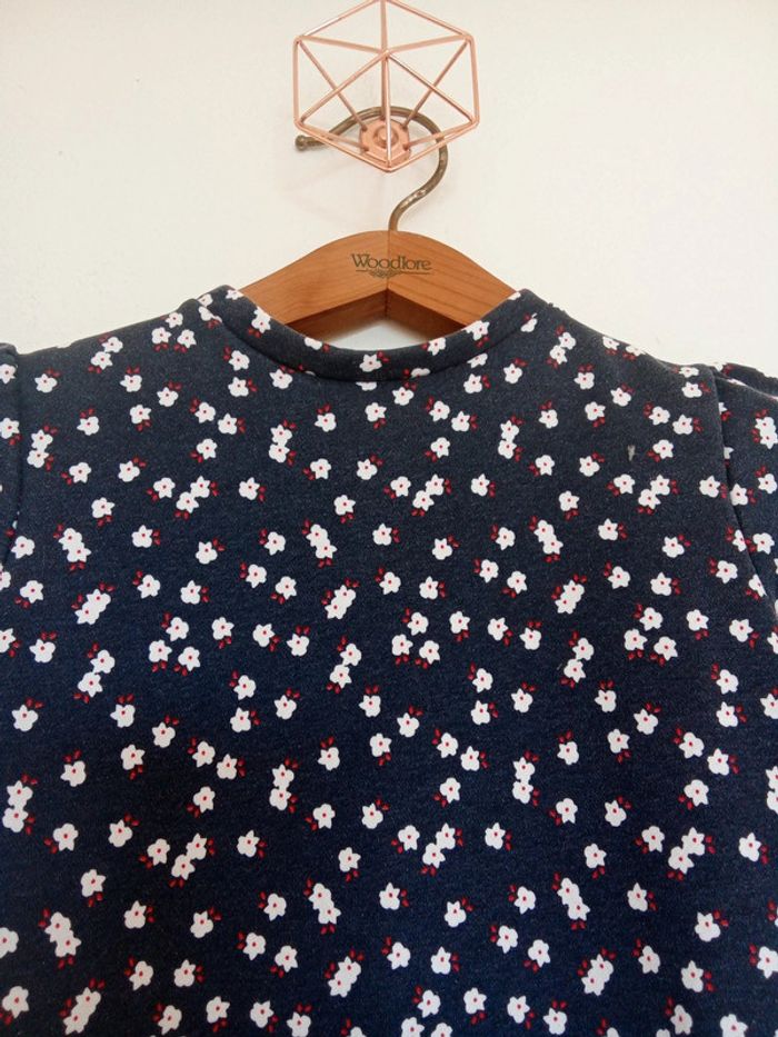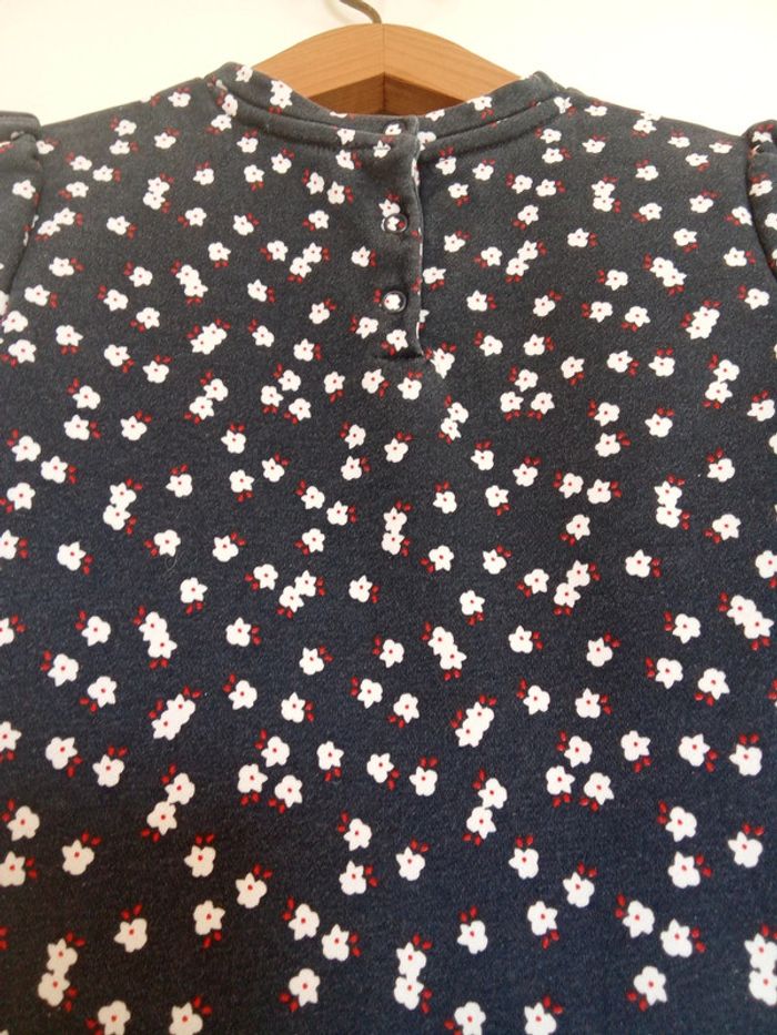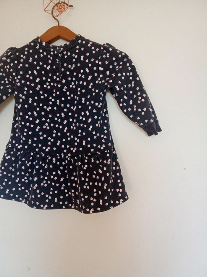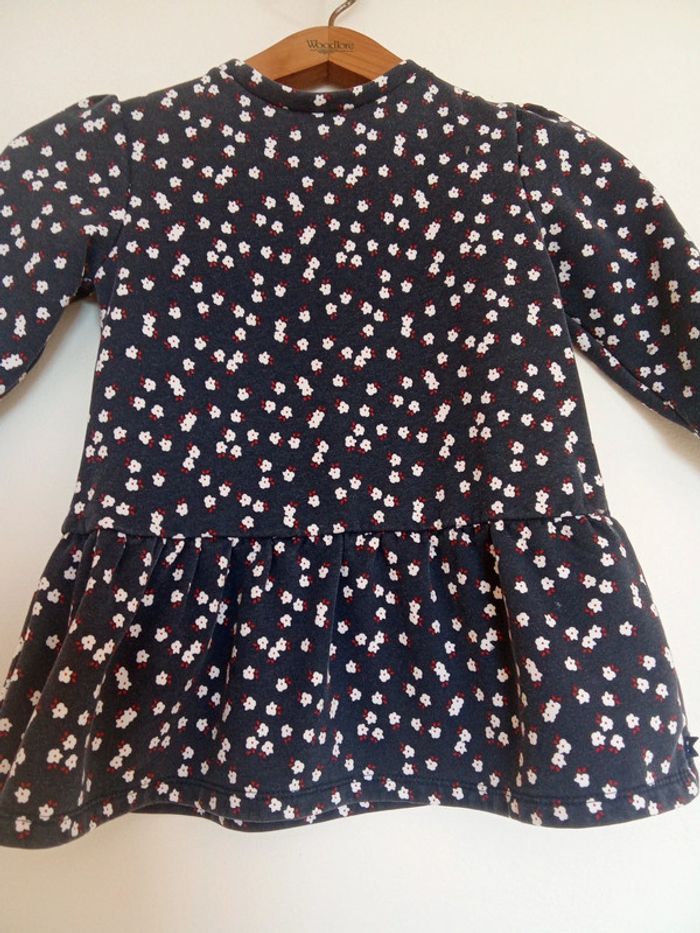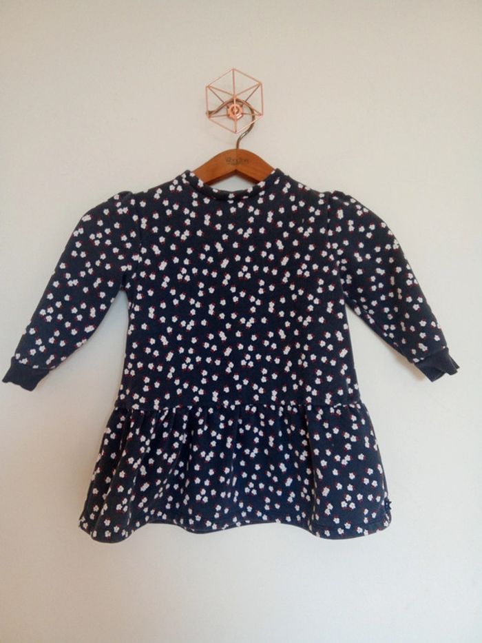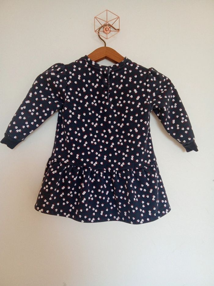 Robe taille 3 ans marque Okaïdi Robe classee en bon état car légèrement délavée, pas de tâches pas de trous Robe de couleur bleu marine avec motif de fleurs. 3 boutons de pression dans le dos, manche élastique au bout. Robe en matière épaisse. #soya91_habits3ans