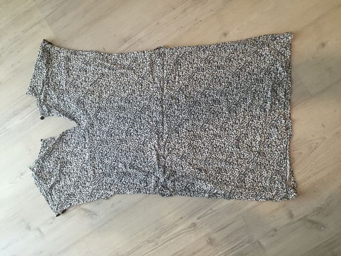 Robe imprimée, manches courtes avec zip sur les épaules, décolleté V, attache bouton en haut du dos, taille comme un S. Passants pour mettre une ceinture fine.