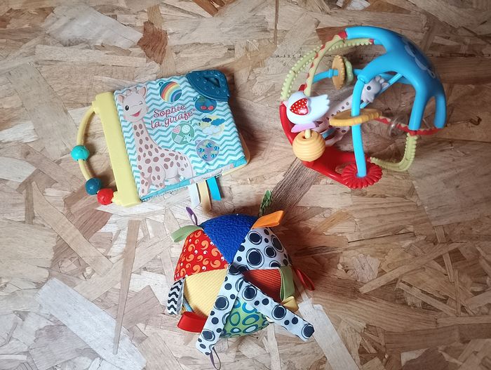 Vends lot jouet dont 2 jouet Gigi la girafe et une boule d'activité pour toucher différentes matières.