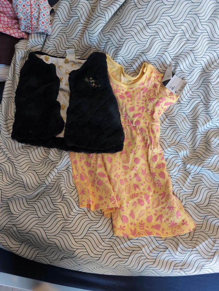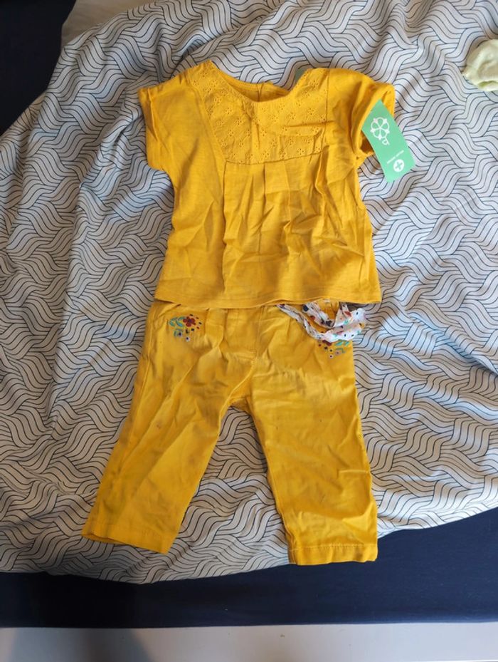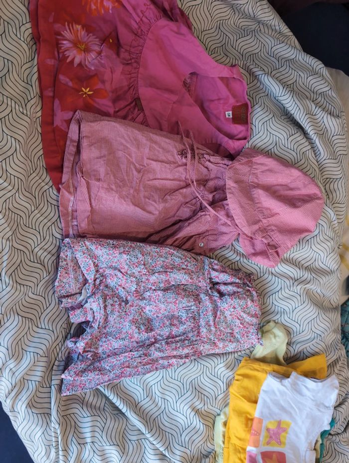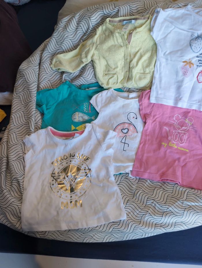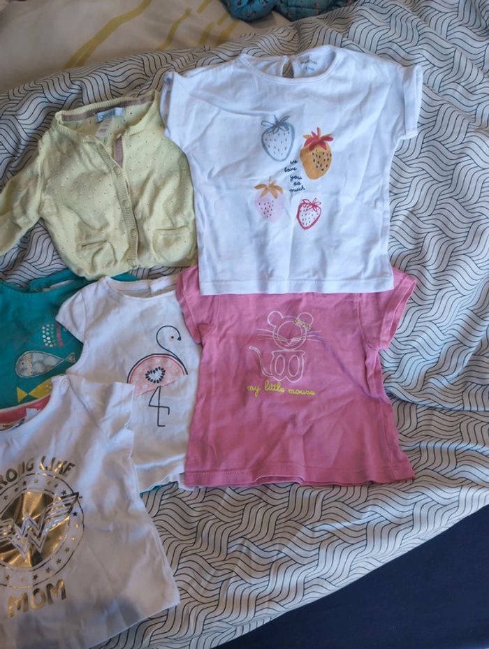 6 tee shirts neufs et tbe obaibi et bout'chou 1 gilet obaibi 1 tenue quasi neuve obaibi et du d 1 robe kenzo, 1 ensemble robe et chapeau Jacadi et une robe manches longues Jacadi 1 gilet sans manche Disney et une robe neuve Idéal pour l'été qui arrive