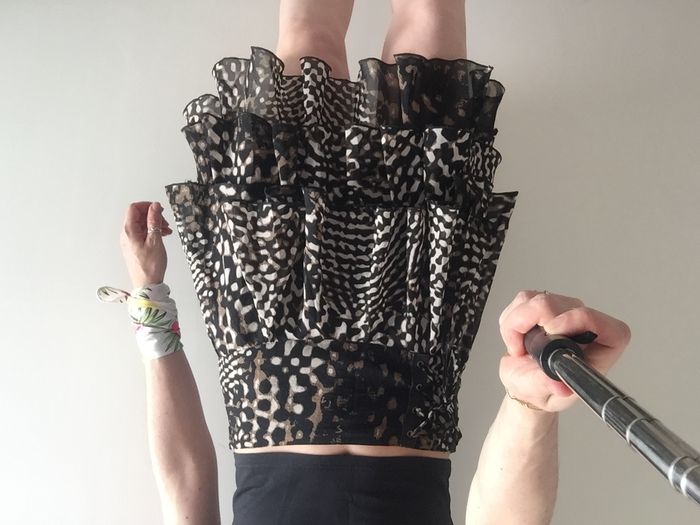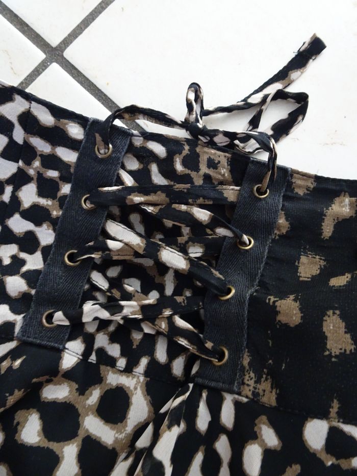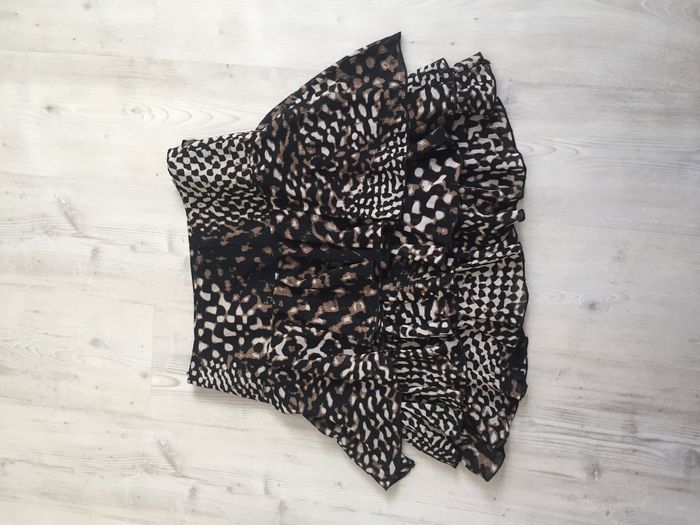 Jupe longueur genou, imprimés animal léopard, jupe à volants, taille 36 / S de chez patrice bréal. Lacets sur le côté, fermeture zip.