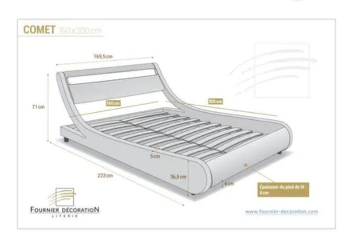 Bonjour je vends un ensemble lit + matelas pour cause de déménagement. Le lit est un COMET 160 CW9116 en simili cuir de la marque Fournier Décoration d'une valeur de 500€. Très facilement montable et démontable (notice fournie avec), le système de LED intégrées est parfaitement fonctionnel, toutes les lattes sont présentes et impeccables, en peuplier, il n'y a aucun défauts ou marques à signaler. Dimensions : 223x169,5x71 cm / 36,5 cm hauteur au pied du lit. Le matelas est un LUXE Mémoire de Formes de la marque Iztoss, d'une valeur de 500€ également. Dimensions du couchage : 160 x 200 cm - Epaisseur du matelas : 28 cm. Quelques marques sur le matelas, mais il a été entièrement lavé et désinfecté. Nous avions acheté le tout 1000€, mais nous le mettons en vente à 350€ negociable. Je reste disponible pour toutes questions ou demandes d'informations en message.