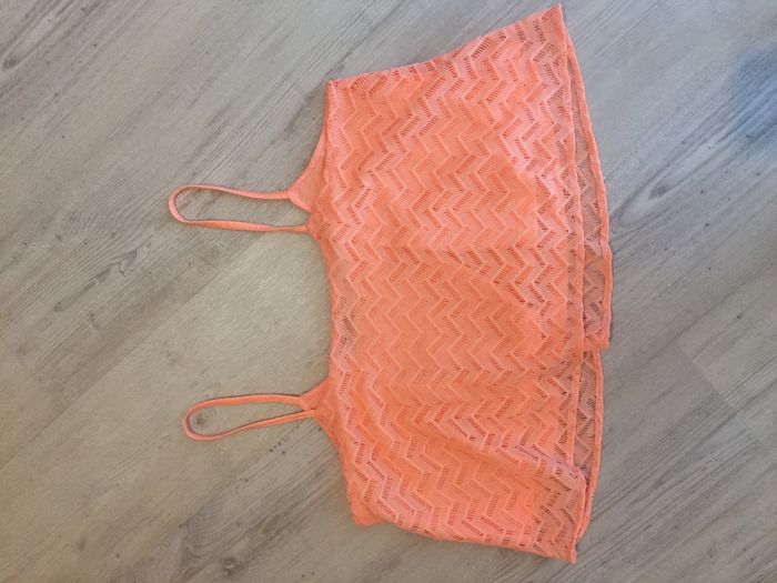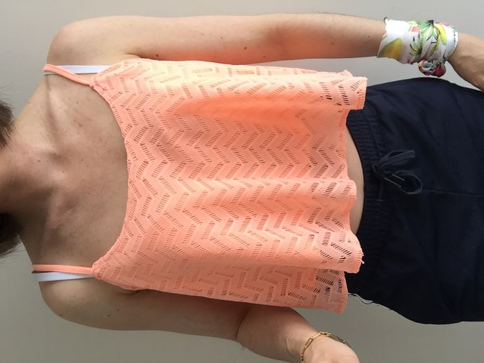 Top court, à fines bretelles, taille S, de chez gémo, non transparent car doublé, dentelle ajourée.