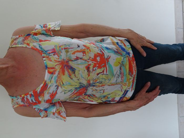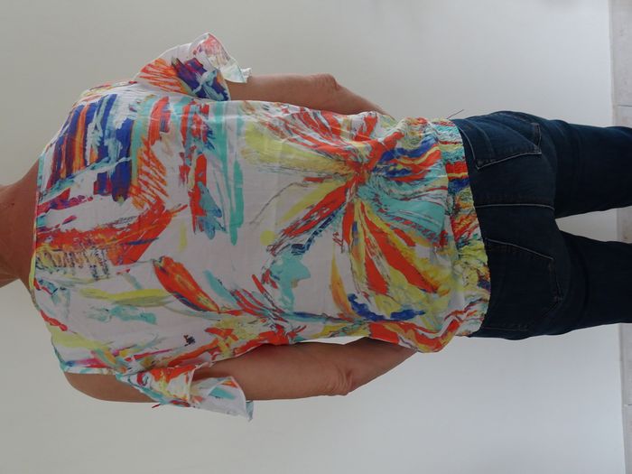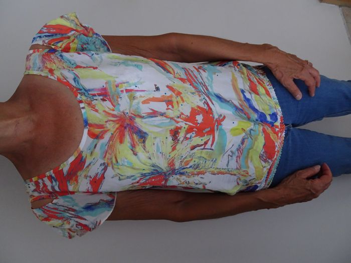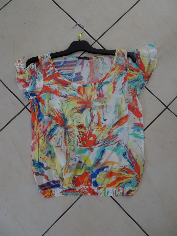 T-shirt imprimés multicolores, de chez bréal, taille M / 38. Epaules dénudées (plus ou moins dénudées avec attache ou sans).