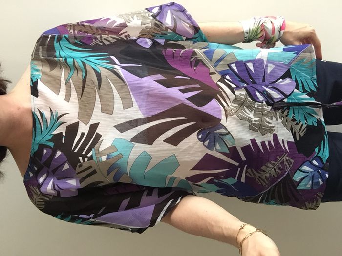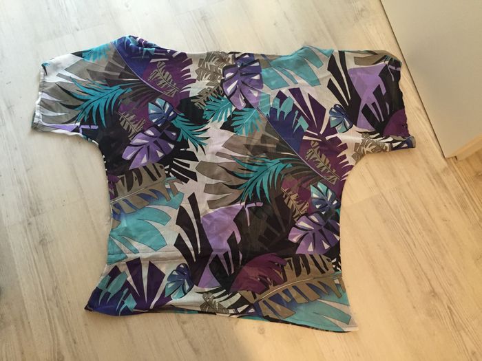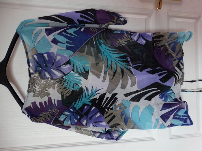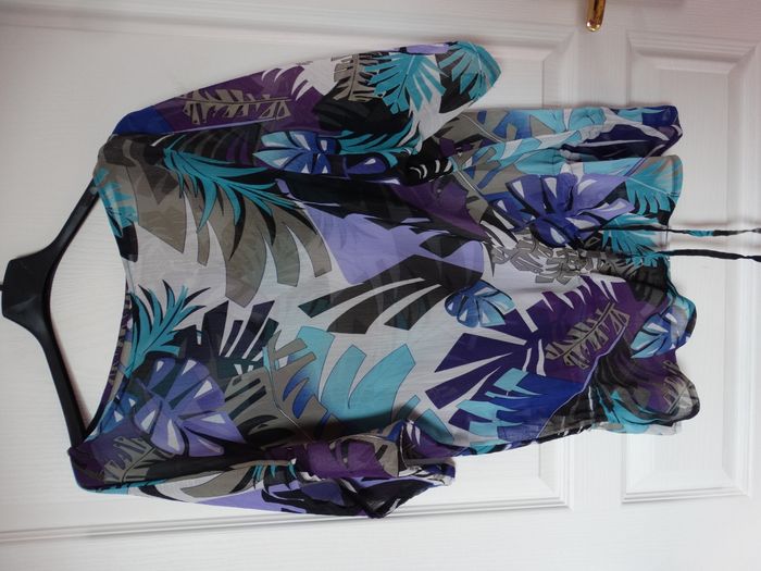 Tunique voile, avec imprimés multicolores, idéal en tunique de plage par dessus le maillot de bain, taille S, de chez pimkie. Ficelle pour resserrer et nouer.