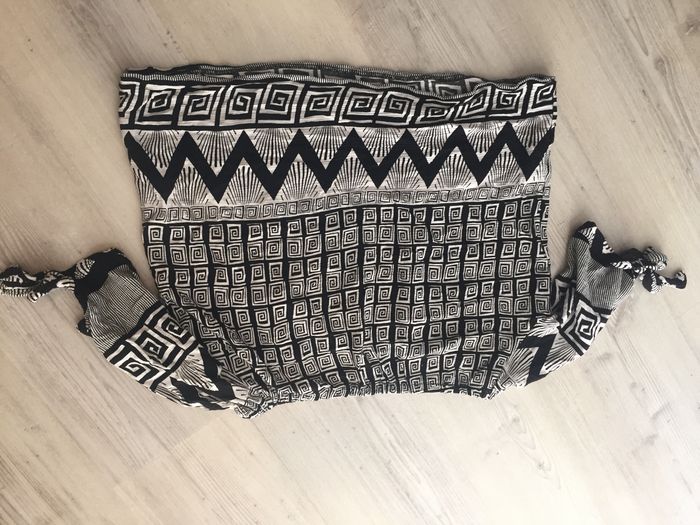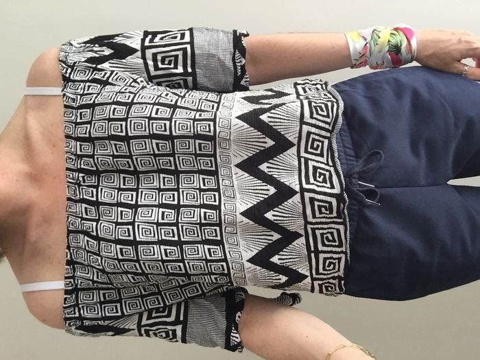 T-shirt manches 3/4 à nouer, épaules nues ou non, élastique au décolleté, avec imprimés noirs et blancs aztèques. Taille S.