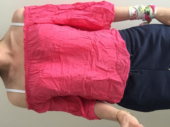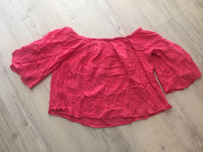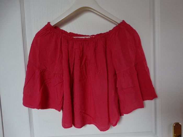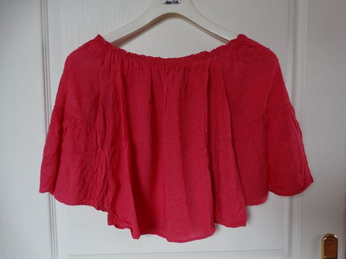 T-shirt manches 3/4 avec épaules dénudées, taille S, motifs petits pois, manches larges. Possibilité de le mettre en épaules dénudées ou non.