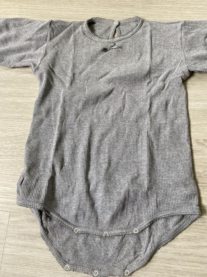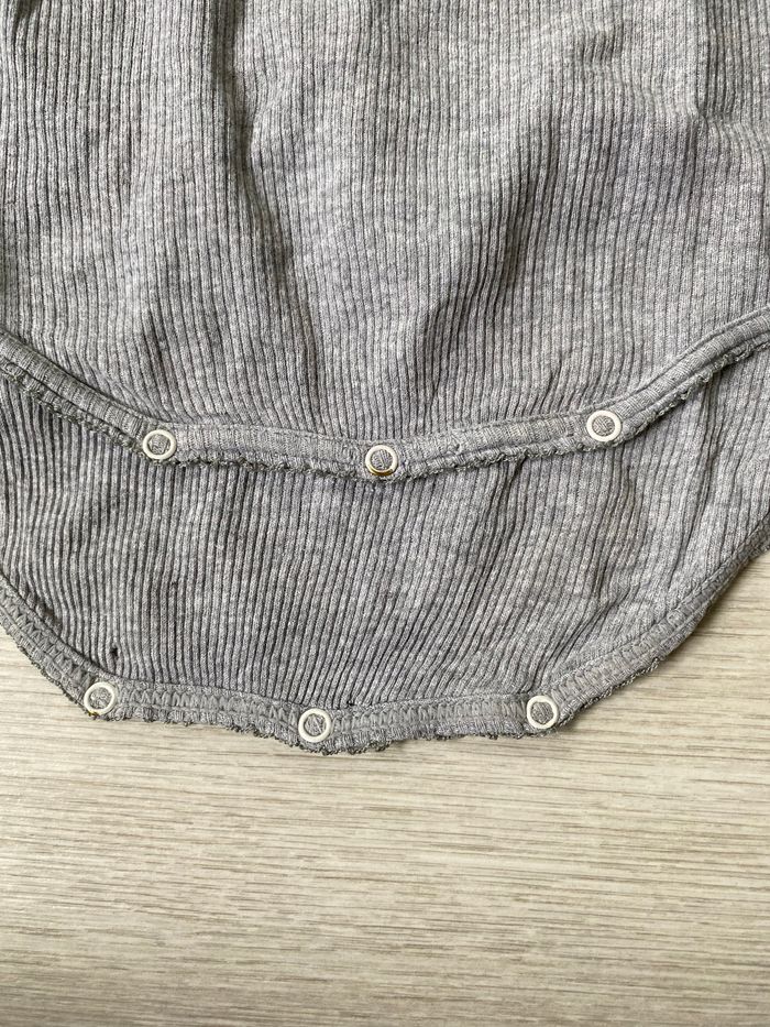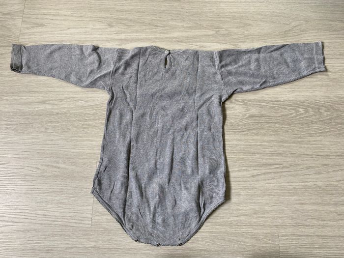 Body maille côtelé, couleur gris, taille 3 ans, bon état, deux petits trous à l’entre jambes comme sur photo à côté des pressions, pressions légèrement dépeintes comme sur photo