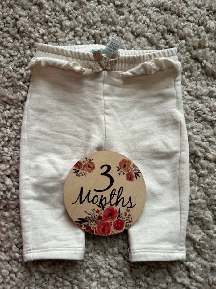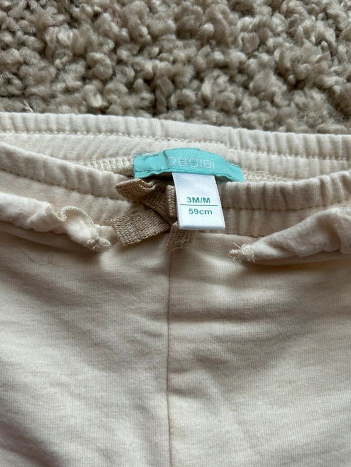 Joli petit pantalon beige texture sweat avec petit volants sur la ceinture et noeud doré