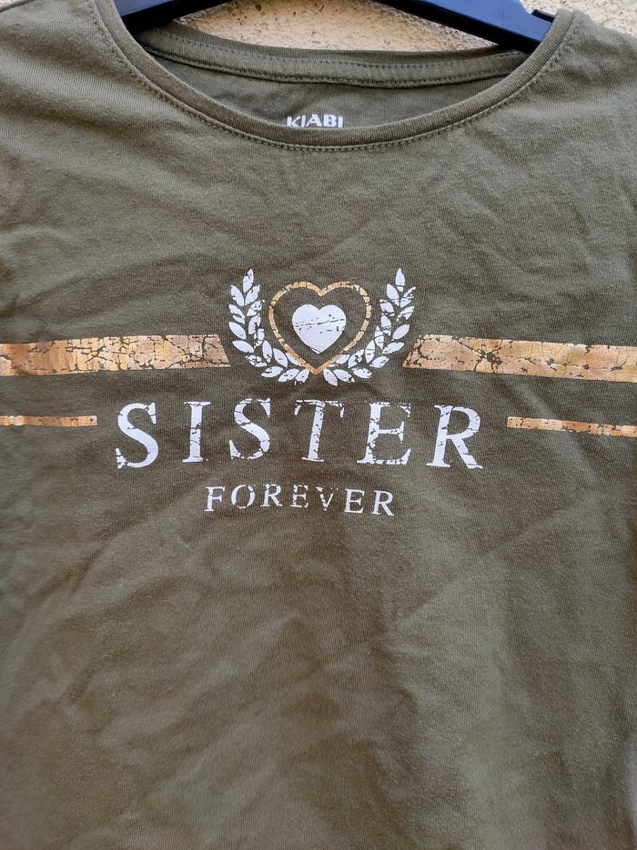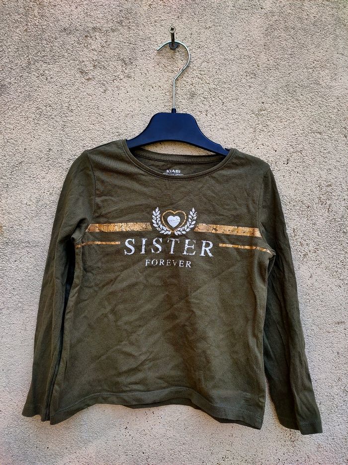 T.shirt manches longues coloris kaki inscription sister forever. Marque Kiabi taille 5 ans. Il est en bon état. Prix ferme, PAS DE NÉGO !!!