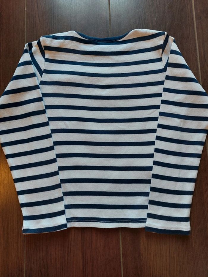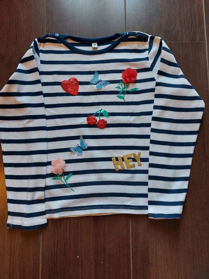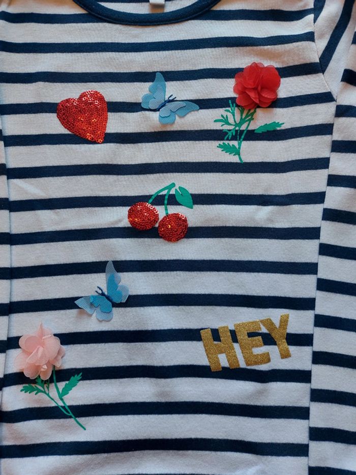 #laetitia8110filleT8ans T-shirt rayé très peu porté. Les pétales de fleurs et les papillons sont en tissu, le cœur et les cerises en sequins et l écriture pailletée.