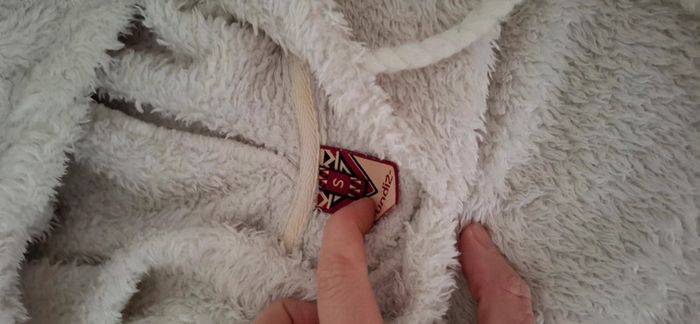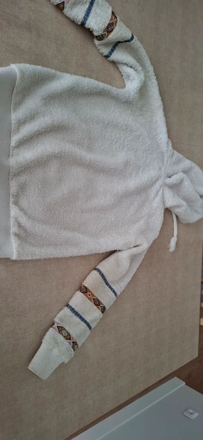 Haut de pyjama doudoune avec capuche et poche Doux et chaud Bon état, légèrement jauni sur les coudes, voir photos 3 et 4