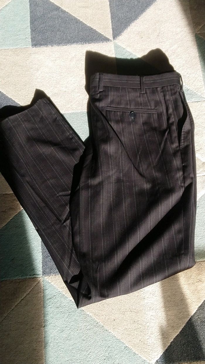Pantalon costume hommes à rayures. 2 poches devant et 2 poches derrière. Fermeture braguette + boutons. Taille 52 Longueur 108cm Longueur entrejambe 83cm Tour ceinture 92cm