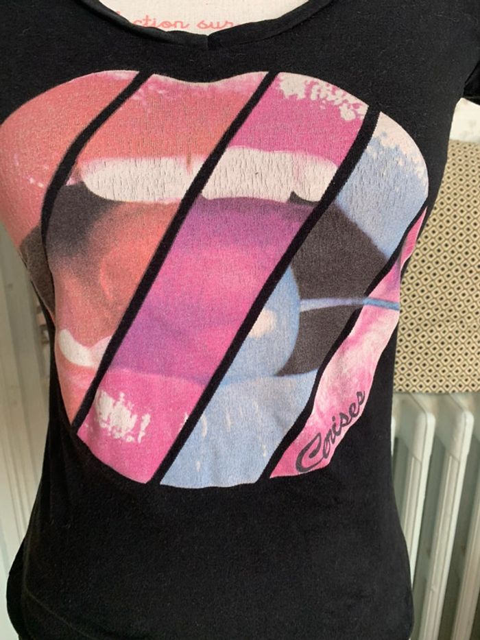 tee shirt noir avec imprimé devant manches courtes bon état, motif un peu craquelé le temps des cerises taille S