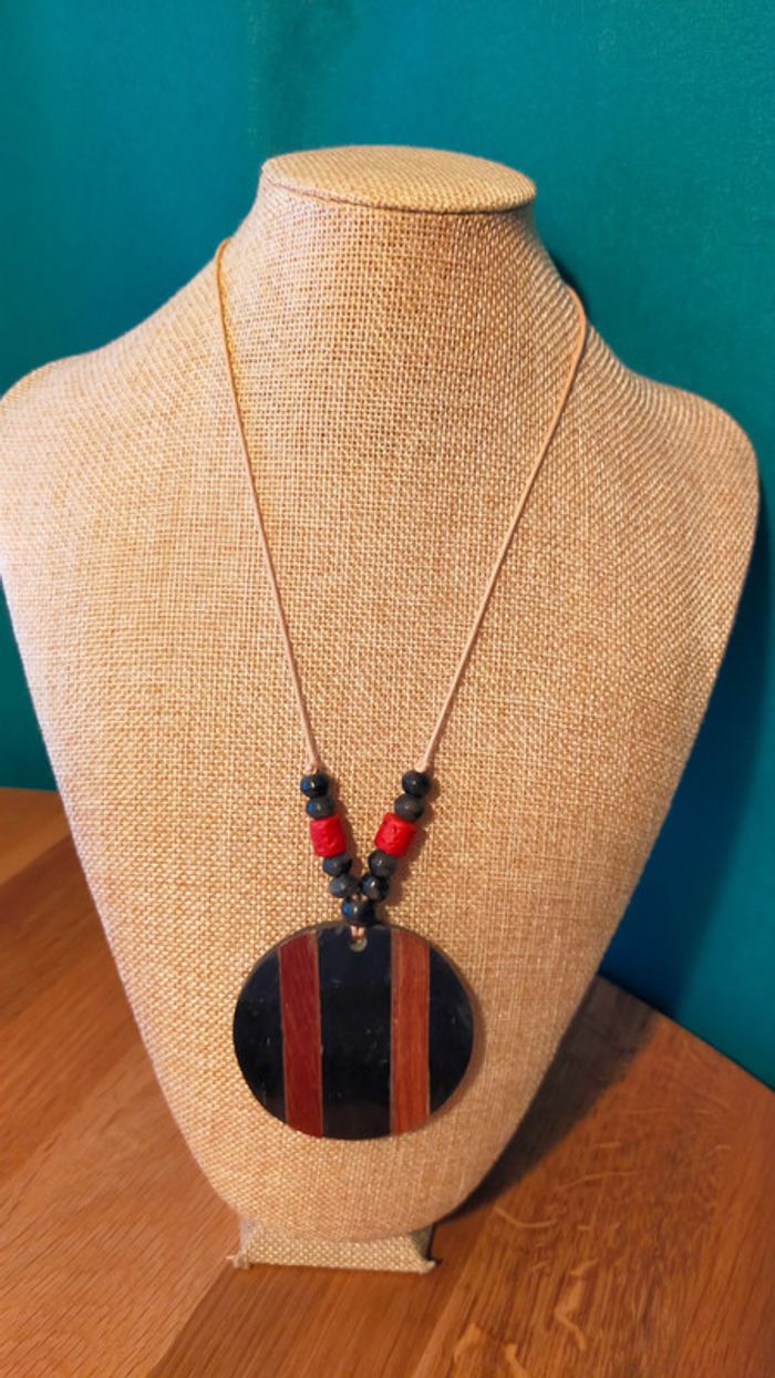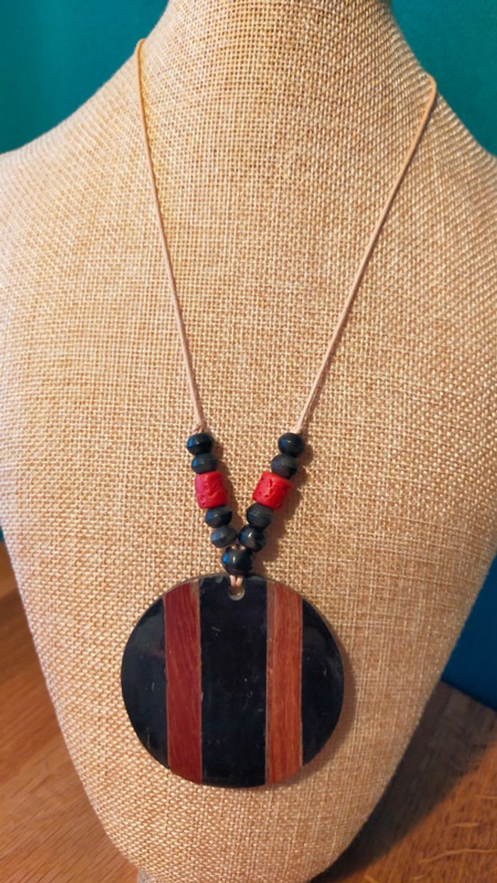 Collier pendentif rond noir & bois – Style ethnique - photo numéro 1