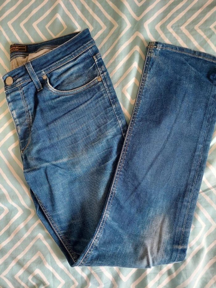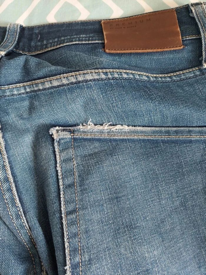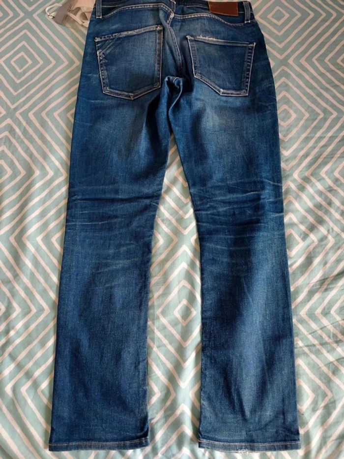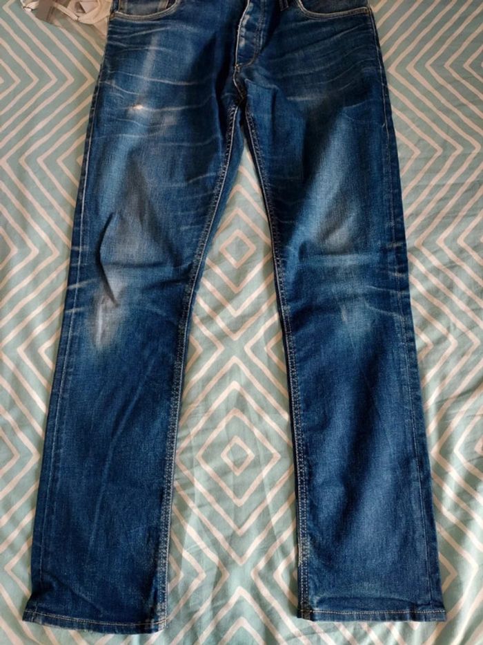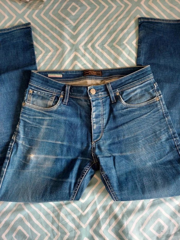 Taille us 32 soit 40/42, jean bleu légèrement délavé a certains endroits, jack and Jones, "usures" legeres sur le bas, et les poches aux fesses, et devant #homme_mondressing11_bv Boite W