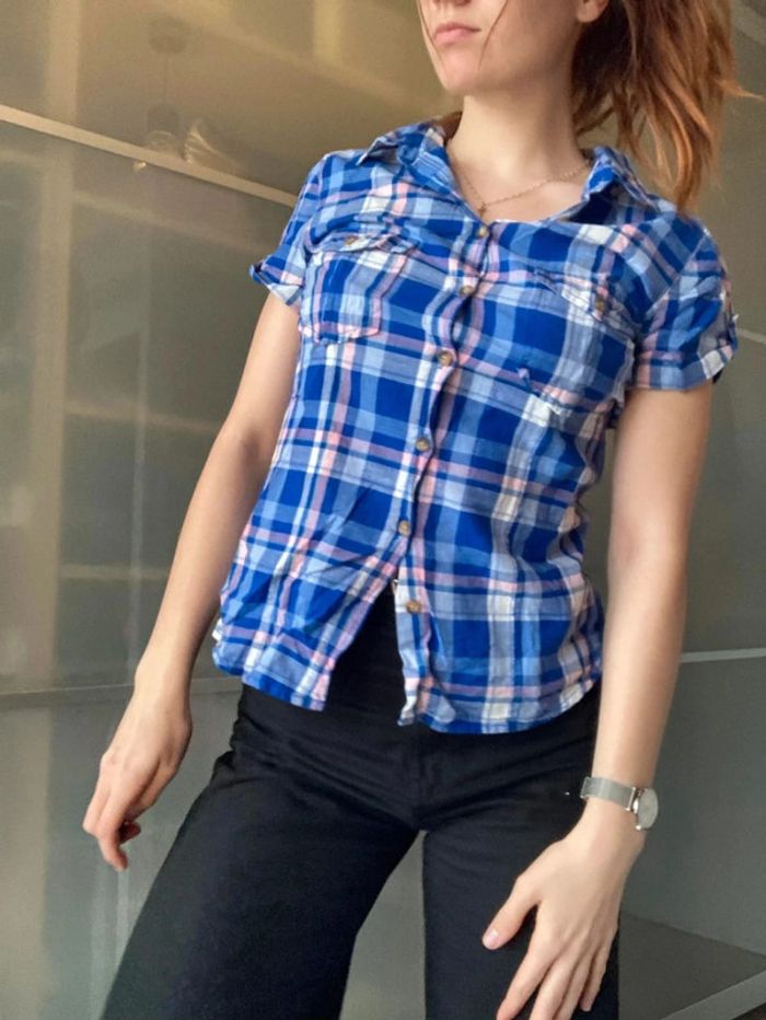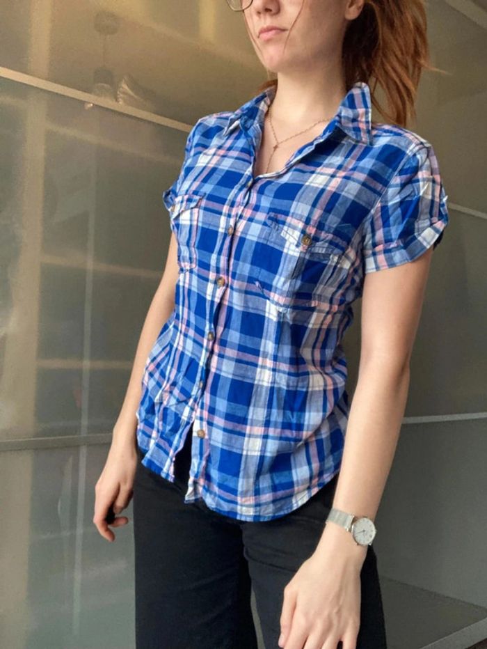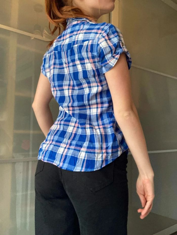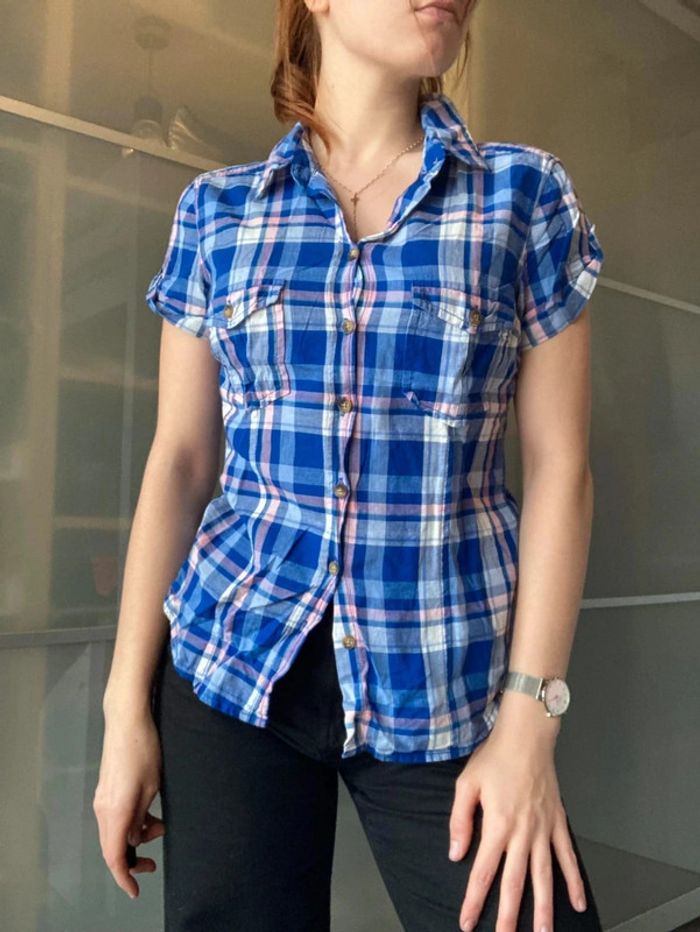 Chemisier manche courte, H&M, carreau bleu rose, taille 38 #femmeM_mondressing11_bv #country Boite Q