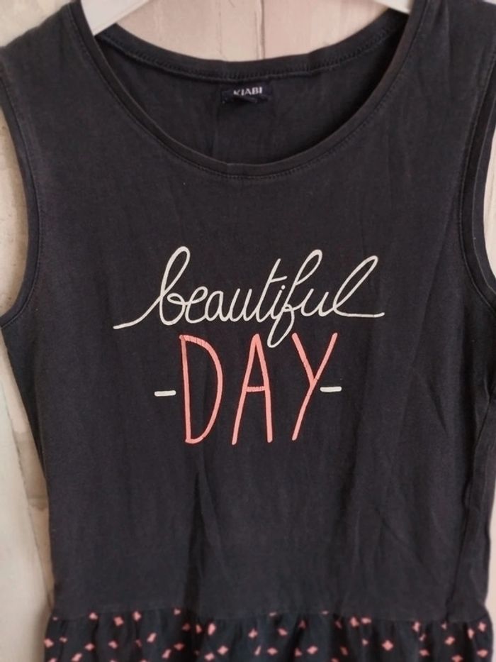 Robe estivales sans manches, écriture sur le devant et motifs en bas. Pourtour du bas de la robe stylisé / découpé. De chez Kiabi, en taille 12 ans. => il y a un reflet sur la photo mais elle n'est pas décolorée en vrai. #rosered16fille #12arosered16 #rosered16fille #12arosered16
