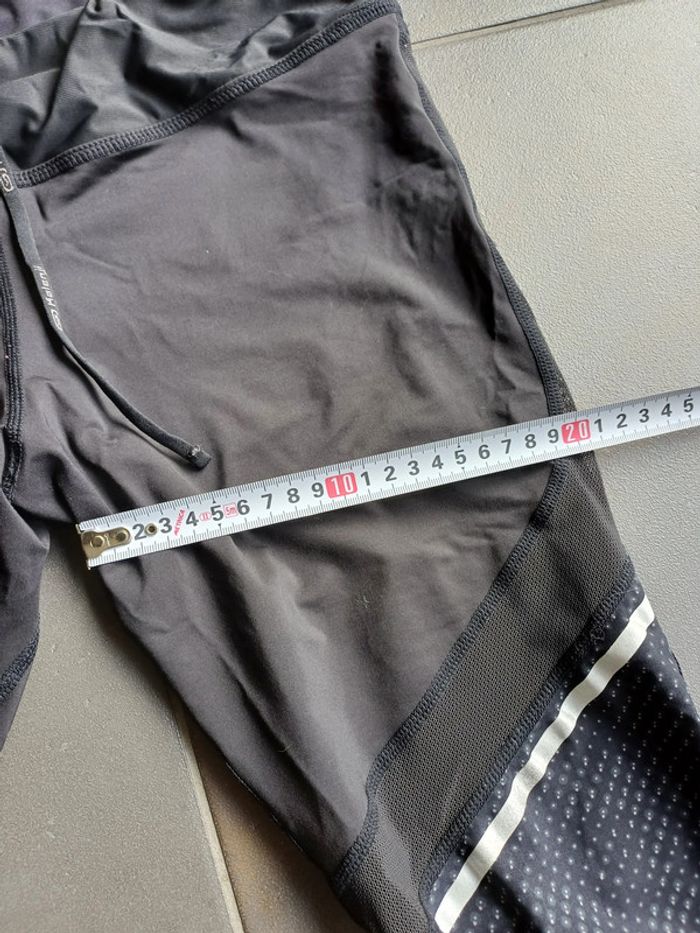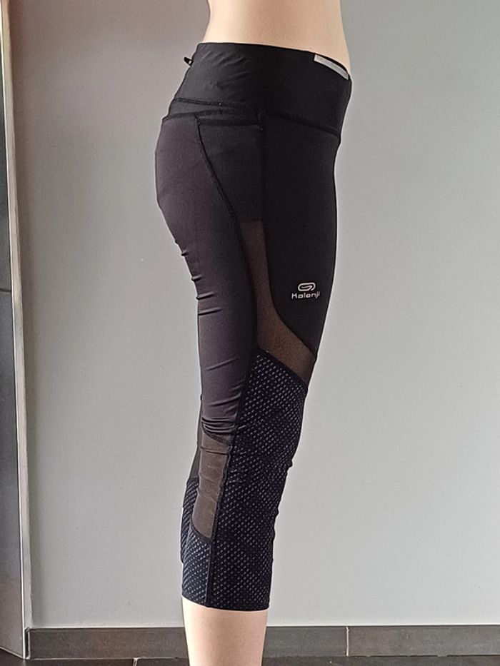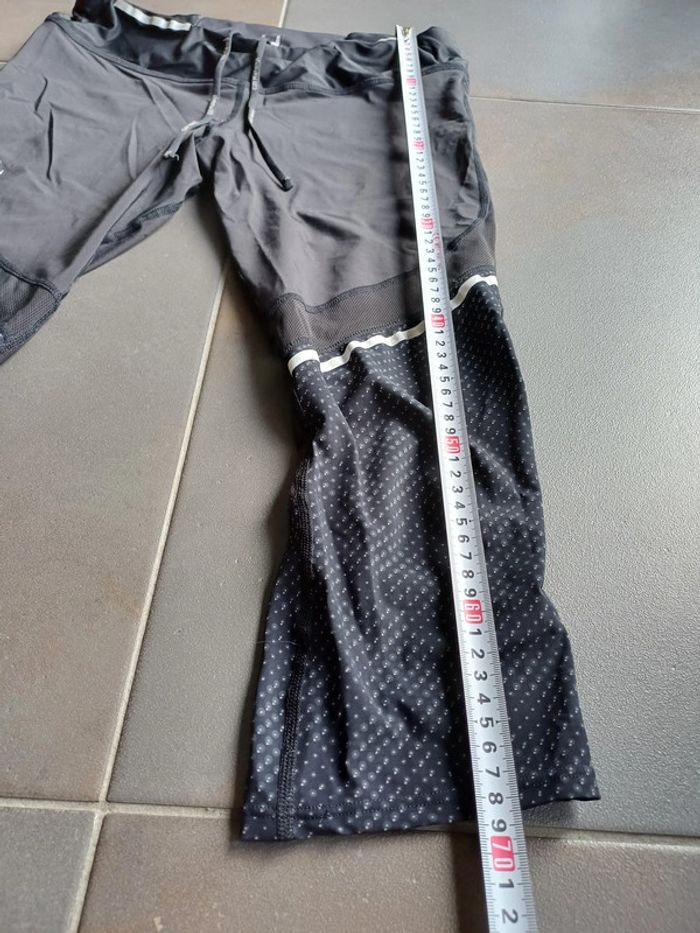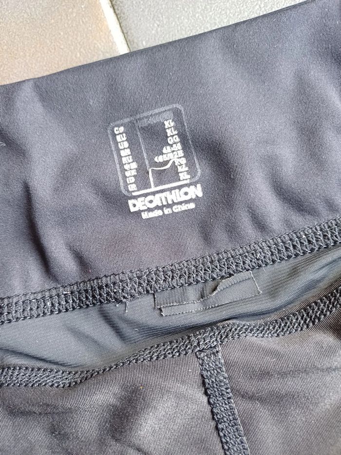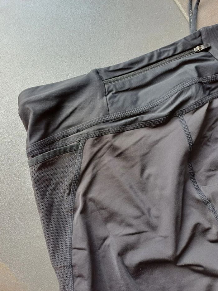 Taille basse avec 2 cordons de serrage. 2 petites poches devant à la ceinture et une derrière zippée. Tissu confortable légèrement compressif qui permet un bon maintien musculaire et limite les micro traumatismes. Bonne évacuation de la transpiration. Taille XL sur l'étiquette mais plutôt un M/L.